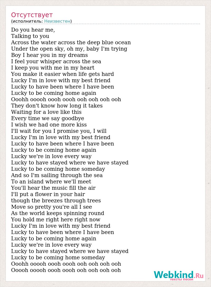 Do you hear me, Talking to you Across the water across the deep blue ocean Under the open sky, oh my, baby I'm trying Boy I hear you in my dreams I feel your whisper across the sea I keep you with me in my heart You make it easier when life gets hard Lucky I'm in love with my best friend Lucky to have been where I have been Lucky to [bad word] home again Ooohh ooooh oooh oooh ooh ooh ooh ooh They don't know how long it takes Waiting for a love like this Every time we say goodbye I wish we had one more kiss I'll wait for you I promise you, I will Lucky I'm in love with my best friend Lucky to have been where I have been Lucky to [bad word] home again Lucky we're in love every way Lucky to have stayed where we have stayed Lucky to [bad word] home someday And so I'm sailing through the sea To an island where we'll meet You'll hear the music fill the air I'll put a flower in your hair though the breezes through trees Move so pretty you're all I see As the world keeps spinning round You hold me right here right now Lucky I'm in love with my best friend Lucky to have been where I have been Lucky to [bad word] home again Lucky we're in love every way Lucky to have stayed where we have stayed Lucky to [bad word] home someday Ooohh ooooh oooh oooh ooh ooh ooh ooh Ooooh ooooh oooh oooh ooh ooh ooh ooh