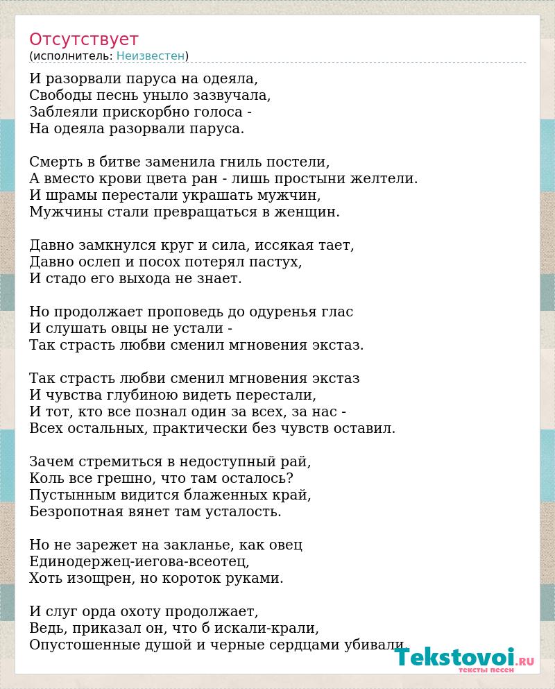 И разорвали паруса на одеяла, Свободы песнь уныло зазвучала, Заблеяли прискорбно голоса - На одеяла разорвали паруса. Смерть в битве заменила гниль постели, А вместо крови цвета ран - лишь простыни желтели. И шрамы перестали украшать мужчин, Мужчины стали превращаться в женщин. Давно замкнулся круг и сила, иссякая тает, Давно ослеп и посох потерял пастух, И стадо его выхода не знает. Но продолжает проповедь до одуренья глас И слушать овцы не устали - Так страсть любви сменил мгновения экстаз. Так страсть любви сменил мгновения экстаз И чувства глубиною видеть перестали, И тот, кто все познал один за всех, за нас - Всех остальных, практически без чувств оставил. Зачем стремиться в недоступный рай, Коль все грешно, что там осталось? Пустынным видится блаженных край, Безропотная вянет там усталость. Но не зарежет на закланье, как овец Единодержец-иегова-всеотец, Хоть изощрен, но короток руками. И слуг орда охоту продолжает, Ведь, приказал он, что б искали-крали, Опустошенные душой и черные сердцами убивали.