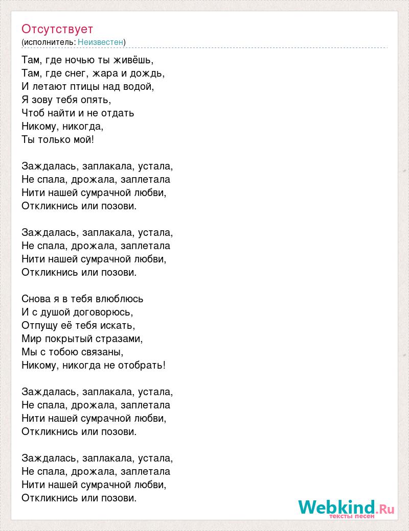 Там, где ночью ты живёшь, Там, где снег, жара и дождь, И летают птицы над водой, Я зову тебя опять, Чтоб найти и не отдать Никому, никогда, Ты только мой! Заждалась, заплакала, устала, Не спала, дрожала, заплетала Нити нашей сумрачной любви, Откликнись или позови. Заждалась, заплакала, устала, Не спала, дрожала, заплетала Нити нашей сумрачной любви, Откликнись или позови. Снова я в тебя влюблюсь И с душой договорюсь, Отпущу её тебя искать, Мир покрытый стразами, Мы с тобою связаны, Никому, никогда не отобрать! Заждалась, заплакала, устала, Не спала, дрожала, заплетала Нити нашей сумрачной любви, Откликнись или позови. Заждалась, заплакала, устала, Не спала, дрожала, заплетала Нити нашей сумрачной любви, Откликнись или позови.
