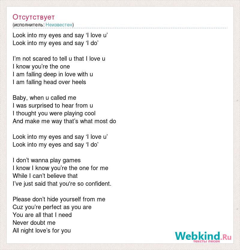 Look into my eyes and say ‘I love u’ Look into my eyes and say ‘I do’ I’m not scared to tell u that I love u I know you’re the one I am falling deep in love with u I am falling head over heels Baby, when u called me I was surprised to hear from u I thought you were playing cool And make me way that’s what most do Look into my eyes and say ‘I love u’ Look into my eyes and say ‘I do’ I don’t wanna play games I know I know you’re the one for me While I can’t believe that I’ve just said that you're so confident. Please don’t hide yourself from me Cuz you’re perfect as you are You are all that I need Never doubt me All night love’s for you