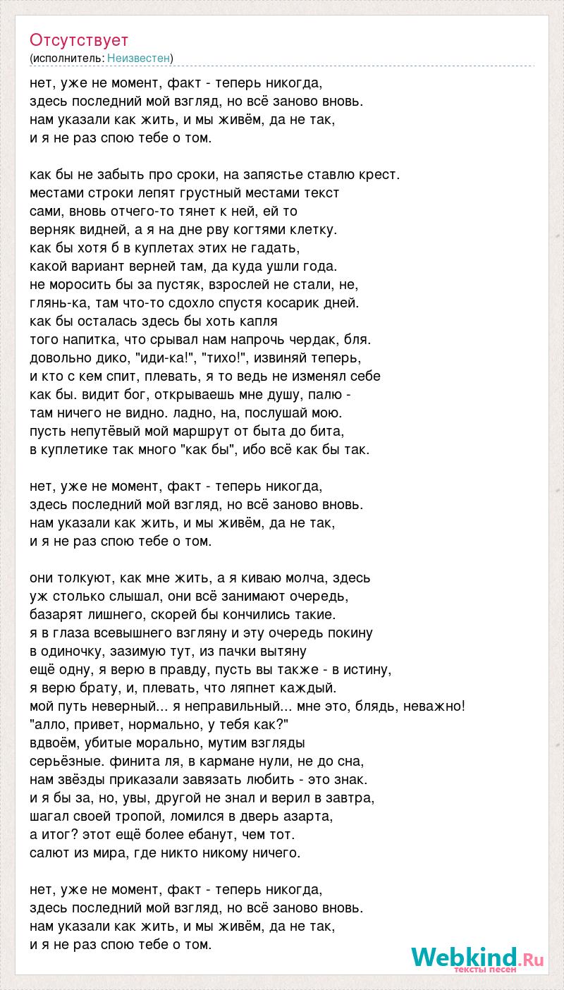нет, уже не момент, факт - теперь никогда, здесь последний мой взгляд, но всё заново вновь. нам указали как жить, и мы живём, да не так, и я не раз спою тебе о том. как бы не забыть про сроки, на запястье ставлю крест. местами строки лепят грустный местами текст сами, вновь отчего-то тянет к ней, ей то верняк видней, а я на дне рву когтями клетку. как бы хотя б в куплетах этих не гадать, какой вариант верней там, да куда ушли года. не моросить бы за пустяк, взрослей не стали, не, глянь-ка, там что-то сдохло спустя косарик дней. как бы осталась здесь бы хоть капля того напитка, что срывал нам напрочь чердак, бля. довольно дико, "иди-ка!", "тихо!", извиняй теперь, и кто с кем спит, плевать, я то ведь не изменял себе как бы. видит бог, открываешь мне душу, палю - там ничего не видно. ладно, на, послушай мою. пусть непутёвый мой маршрут от быта до бита, в куплетике так много "как бы", ибо всё как бы так. нет, уже не момент, факт - теперь никогда, здесь последний мой взгляд, но всё заново вновь. нам указали как жить, и мы живём, да не так, и я не раз спою тебе о том. они толкуют, как мне жить, а я киваю молча, здесь уж столько слышал, они всё занимают очередь, базарят лишнего, скорей бы кончились такие. я в глаза всевышнего взгляну и эту очередь покину в одиночку, зазимую тут, из пачки вытяну ещё одну, я верю в правду, пусть вы также - в истину, я верю брату, и, плевать, что ляпнет каждый. мой путь неверный... я неправильный... мне это, блядь, неважно! "алло, привет, нормально, у тебя как?" вдвоём, убитые морально, мутим взгляды серьёзные. финита ля, в кармане нули, не до сна, нам звёзды приказали завязать любить - это знак. и я бы за, но, увы, другой не знал и верил в завтра, шагал своей тропой, ломился в дверь азарта, а итог? этот ещё более ебанут, чем тот. салют из мира, где никто никому ничего. нет, уже не момент, факт - теперь никогда, здесь последний мой взгляд, но всё заново вновь. нам указали как жить, и мы живём, да не так, и я не раз спою тебе о том.