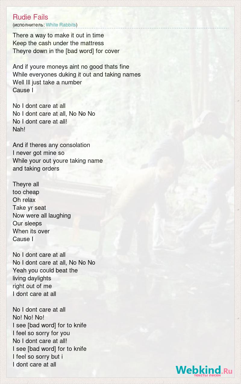 There a way to make it out in time Keep the cash under the mattress Theyre down in the [bad word] for cover And if youre moneys aint no good thats fine While everyones duking it out and taking names Well Ill just take a number Cause I No I dont care at all No I dont care at all, No No No No I dont care at all! Nah! And if theres any consolation I never got mine so While your out youre taking name and taking orders Theyre all too cheap Oh relax Take yr seat Now were all laughing Our sleeps When its over Cause I No I dont care at all No I dont care at all, No No No Yeah you could beat the living daylights right out of me I dont care at all No I dont care at all No! No! No! I see [bad word] for to knife I feel so sorry for you No I dont care at all! I see [bad word] for to knife I feel so sorry but i I dont care at all