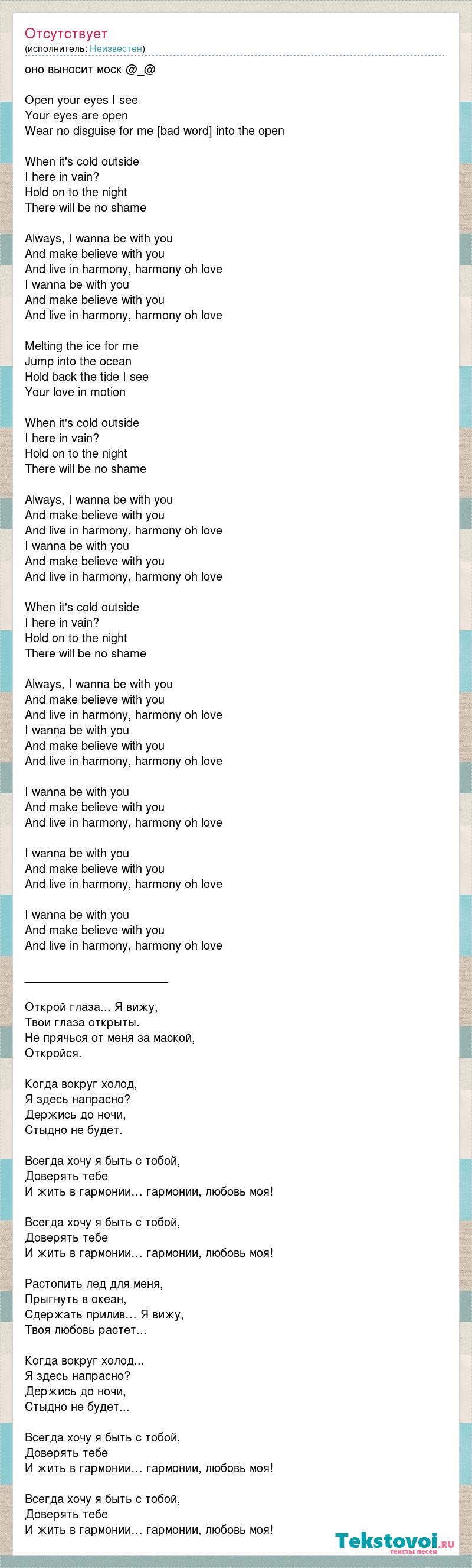 оно выносит моск @_@ Open your eyes I see Your eyes are open Wear no disguise for me [bad word] into the open When it's cold outside I here in vain? Hold on to the night There will be no shame Always, I wanna be with you And make believe with you And live in harmony, harmony oh love I wanna be with you And make believe with you And live in harmony, harmony oh love Melting the ice for me Jump into the ocean Hold back the tide I see Your love in motion When it's cold outside I here in vain? Hold on to the night There will be no shame Always, I wanna be with you And make believe with you And live in harmony, harmony oh love I wanna be with you And make believe with you And live in harmony, harmony oh love When it's cold outside I here in vain? Hold on to the night There will be no shame Always, I wanna be with you And make believe with you And live in harmony, harmony oh love I wanna be with you And make believe with you And live in harmony, harmony oh love I wanna be with you And make believe with you And live in harmony, harmony oh love I wanna be with you And make believe with you And live in harmony, harmony oh love I wanna be with you And make believe with you And live in harmony, harmony oh love ______________________ Открой глаза... Я вижу, Твои глаза открыты. Не прячься от меня за маской, Откройся. Когда вокруг холод, Я здесь напрасно? Держись до ночи, Стыдно не будет. Всегда хочу я быть с тобой, Доверять тебе И жить в гармонии… гармонии, любовь моя! Всегда хочу я быть с тобой, Доверять тебе И жить в гармонии… гармонии, любовь моя! Растопить лед для меня, Прыгнуть в океан, Сдержать прилив… Я вижу, Твоя любовь растет... Когда вокруг холод... Я здесь напрасно? Держись до ночи, Стыдно не будет... Всегда хочу я быть с тобой, Доверять тебе И жить в гармонии… гармонии, любовь моя! Всегда хочу я быть с тобой, Доверять тебе И жить в гармонии… гармонии, любовь моя!