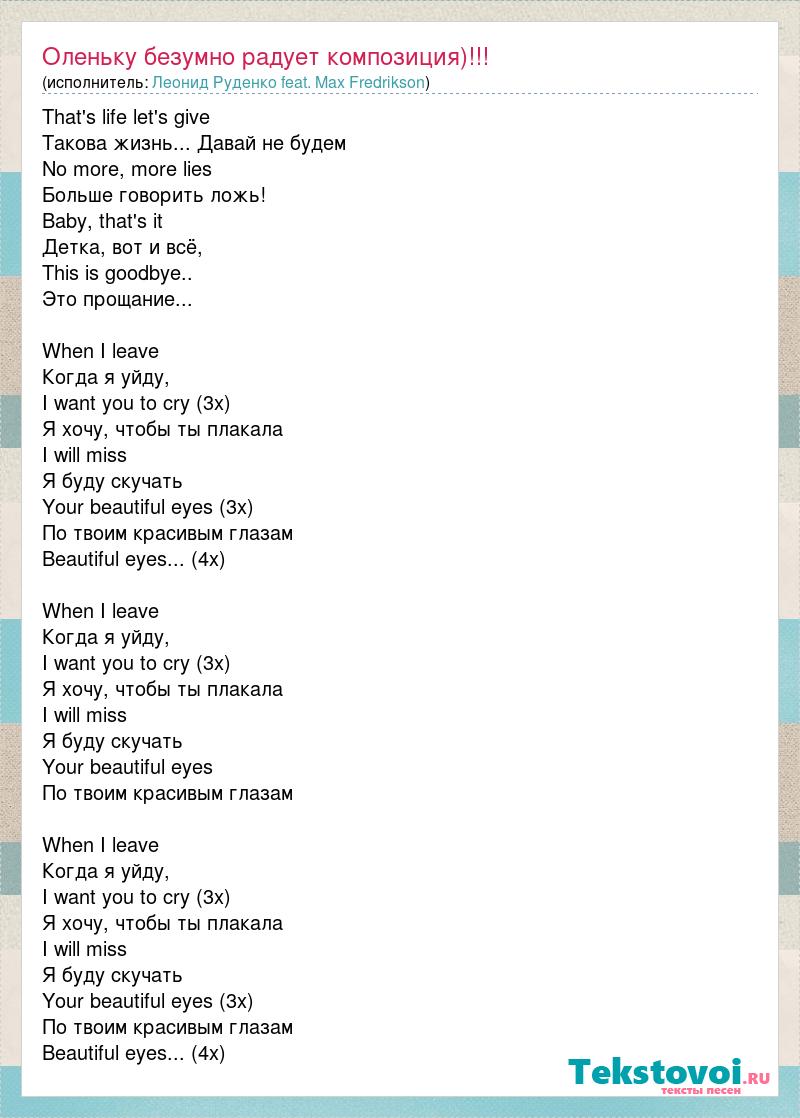 That's life let's give Такова жизнь... Давай не будем No more, more lies Больше говорить ложь! Baby, that's it Детка, вот и всё, This is goodbye.. Это прощание... When I leave Когда я уйду, I want you to cry (3x) Я хочу, чтобы ты плакала I will miss Я буду скучать Your beautiful eyes (3x) По твоим красивым глазам Beautiful eyes... (4x) When I leave Когда я уйду, I want you to cry (3x) Я хочу, чтобы ты плакала I will miss Я буду скучать Your beautiful eyes По твоим красивым глазам When I leave Когда я уйду, I want you to cry (3x) Я хочу, чтобы ты плакала I will miss Я буду скучать Your beautiful eyes (3x) По твоим красивым глазам Beautiful eyes... (4x)