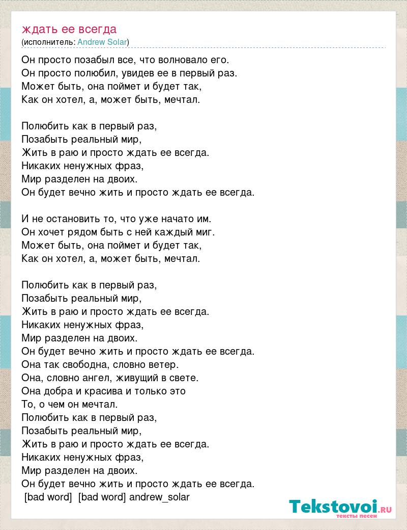 Он просто позабыл все, что волновало его. Он просто полюбил, увидев ее в первый раз. Может быть, она поймет и будет так, Как он хотел, а, может быть, мечтал. Полюбить как в первый раз, Позабыть реальный мир, Жить в раю и просто ждать ее всегда. Никаких ненужных фраз, Мир разделен на двоих. Он будет вечно жить и просто ждать ее всегда. И не остановить то, что уже начато им. Он хочет рядом быть с ней каждый миг. Может быть, она поймет и будет так, Как он хотел, а, может быть, мечтал. Полюбить как в первый раз, Позабыть реальный мир, Жить в раю и просто ждать ее всегда. Никаких ненужных фраз, Мир разделен на двоих. Он будет вечно жить и просто ждать ее всегда. Она так свободна, словно ветер. Она, словно ангел, живущий в свете. Она добра и красива и только это То, о чем он мечтал. Полюбить как в первый раз, Позабыть реальный мир, Жить в раю и просто ждать ее всегда. Никаких ненужных фраз, Мир разделен на двоих. Он будет вечно жить и просто ждать ее всегда. [bad word] [bad word] andrew_solar