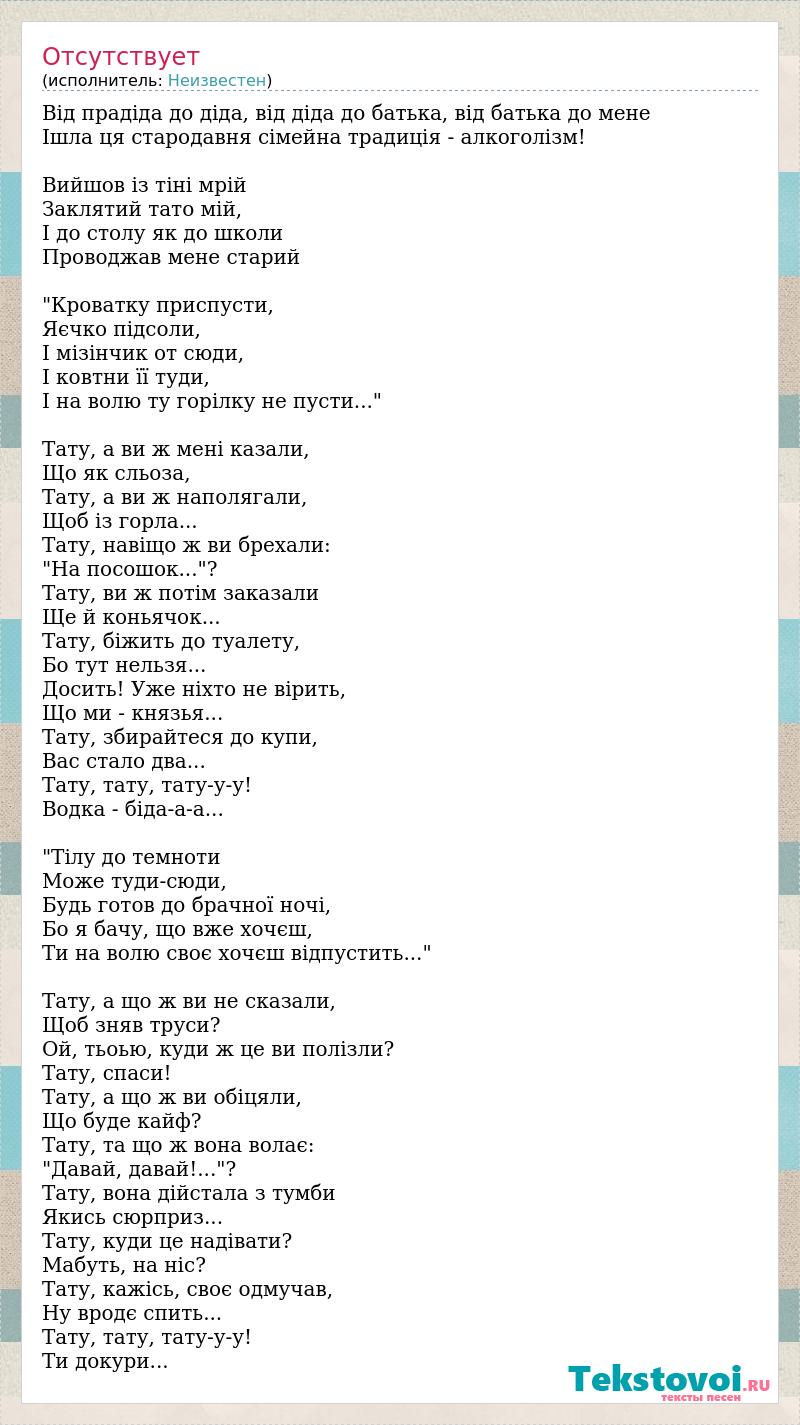Від прадіда до діда, від діда до батька, від батька до мене Ішла ця стародавня сімейна традиція - алкоголізм! Вийшов із тіні мрій Заклятий тато мій, І до столу як до школи Проводжав мене старий "Кроватку приспусти, Яєчко підсоли, І мізінчик от сюди, І ковтни її туди, І на волю ту горілку не пусти..." Тату, а ви ж мені казали, Що як сльоза, Тату, а ви ж наполягали, Щоб із горла... Тату, навіщо ж ви брехали: "На посошок..."? Тату, ви ж потім заказали Ще й коньячок... Тату, біжить до туалету, Бо тут нельзя... Досить! Уже ніхто не вірить, Що ми - князья... Тату, збирайтеся до купи, Вас стало два... Тату, тату, тату-у-у! Водка - біда-а-а... "Тілу до темноти Може туди-сюди, Будь готов до брачної ночі, Бо я бачу, що вже хочєш, Ти на волю своє хочєш відпустить..." Тату, а що ж ви не сказали, Щоб зняв труси? Ой, тьоью, куди ж це ви полізли? Тату, спаси! Тату, а що ж ви обіцяли, Що буде кайф? Тату, та що ж вона волає: "Давай, давай!..."? Тату, вона дійстала з тумби Якись сюрприз... Тату, куди це надівати? Мабуть, на ніс? Тату, кажісь, своє одмучав, Ну вродє спить... Тату, тату, тату-у-у! Ти докури...