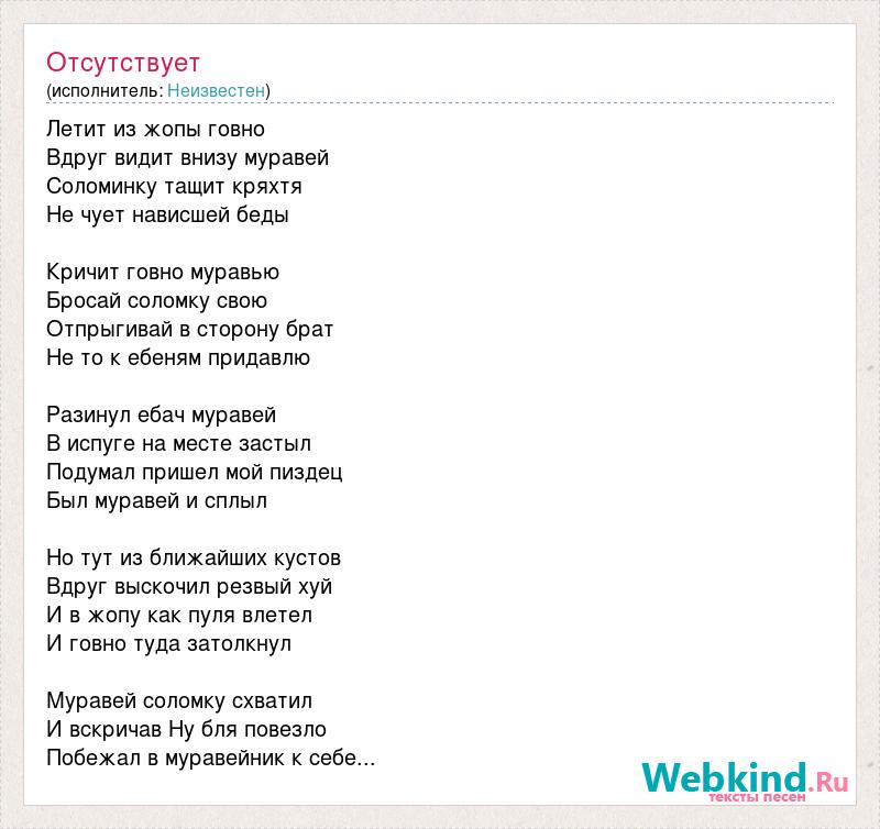 Летит из жопы говно Вдруг видит внизу муравей Соломинку тащит кряхтя Не чует нависшей беды Кричит говно муравью Бросай соломку свою Отпрыгивай в сторону брат Не то к ебеням придавлю Разинул ебач муравей В испуге на месте застыл Подумал пришел мой пиздец Был муравей и сплыл Но тут из ближайших кустов Вдруг выскочил резвый хуй И в жопу как пуля влетел И говно туда затолкнул Муравей соломку схватил И вскричав Ну бля повезло Побежал в муравейник к себе...