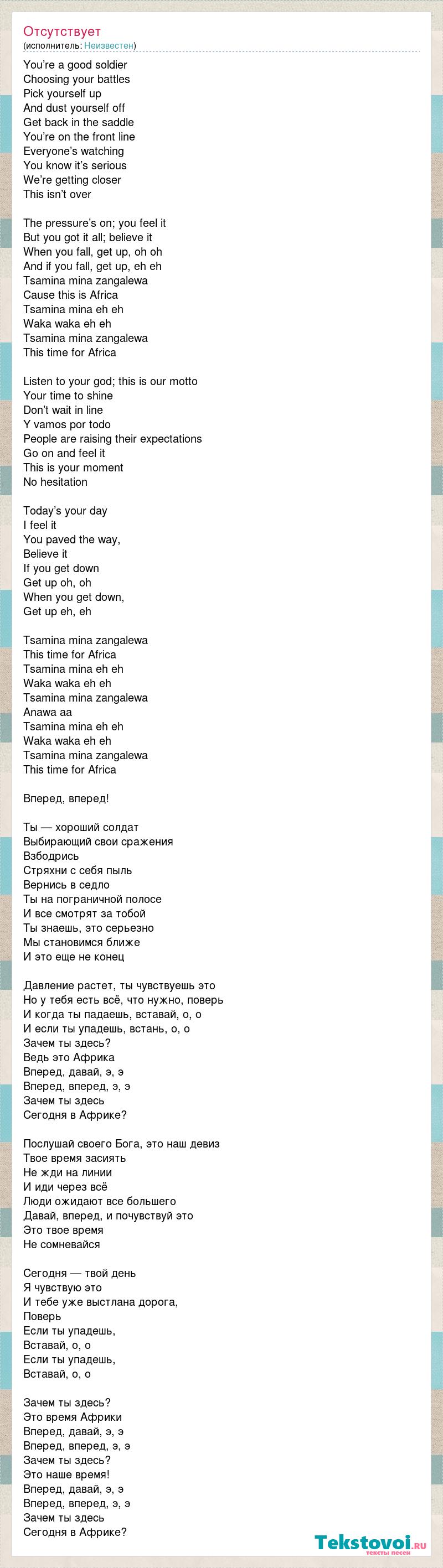 You’re a good soldier Choosing your battles Pick yourself up And dust yourself off Get back in the saddle You’re on the front line Everyone’s watching You know it’s serious We’re getting closer This isn’t over The pressure’s on; you feel it But you got it all; believe it When you fall, get up, oh oh And if you fall, get up, eh eh Tsamina mina zangalewa Cause this is Africa Tsamina mina eh eh Waka waka eh eh Tsamina mina zangalewa This time for Africa Listen to your god; this is our motto Your time to shine Don’t wait in line Y vamos por todo People are raising their expectations Go on and feel it This is your moment No hesitation Today’s your day I feel it You paved the way, Believe it If you get down Get up oh, oh When you get down, Get up eh, eh Tsamina mina zangalewa This time for Africa Tsamina mina eh eh Waka waka eh eh Tsamina mina zangalewa Anawa aa Tsamina mina eh eh Waka waka eh eh Tsamina mina zangalewa This time for Africa Вперед, вперед! Ты — хороший солдат Выбирающий свои сражения Взбодрись Стряхни с себя пыль Вернись в седло Ты на пограничной полосе И все смотрят за тобой Ты знаешь, это серьезно Мы становимся ближе И это еще не конец Давление растет, ты чувствуешь это Но у тебя есть всё, что нужно, поверь И когда ты падаешь, вставай, о, о И если ты упадешь, встань, о, о Зачем ты здесь? Ведь это Африка Вперед, давай, э, э Вперед, вперед, э, э Зачем ты здесь Сегодня в Африке? Послушай своего Бога, это наш девиз Твое время засиять Не жди на линии И иди через всё Люди ожидают все большего Давай, вперед, и почувствуй это Это твое время Не сомневайся Сегодня — твой день Я чувствую это И тебе уже выстлана дорога, Поверь Если ты упадешь, Вставай, о, о Если ты упадешь, Вставай, о, о Зачем ты здесь? Это время Африки Вперед, давай, э, э Вперед, вперед, э, э Зачем ты здесь? Это наше время! Вперед, давай, э, э Вперед, вперед, э, э Зачем ты здесь Сегодня в Африке?