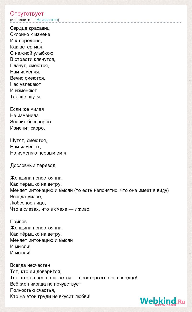 Сердце красавиц Склонно к измене И к перемене, Как ветер мая. С нежной улыбкою В страсти клянутся, Плачут, смеются, Нам изменяя. Вечно смеются, Нас увлекают И изменяют Так же, шутя. Если же милая Не изменила Значит бесспорно Изменит скоро. Шутят, смеются, Нам изменют, Но изменяю первым им я Дословный перевод Женщина непостоянна, Как перышко на ветру, Меняет интонацию и мысли (то есть непонятно, что она имеет в виду) Всегда милое, Любезное лицо, Что в слезах, что в смехе — лживо. Припев Женщина непостоянна, Как пёрышко на ветру, Меняет интонацию и мысли И мысли! И мысли! Всегда несчастен Тот, кто ей доверится, Тот, кто на неё полагается — неосторожно его сердце! Всё же никогда не почувствует Полностью счастья, Кто на этой груди не вкусит любви!
