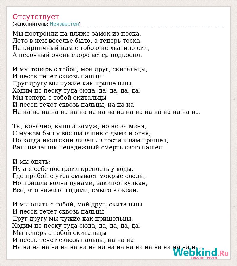 Мы построили на пляже замок из песка. Лето в нем веселье было, а теперь тоска. На кирпичный нам с тобою не хватило сил, А песочный очень скоро ветер подкосил. И мы теперь с тобой, мой друг, скитальцы, И песок течет сквозь пальцы. Друг другу мы чужие как пришельцы, Ходим по песку туда сюда, да, да, да, да. Мы теперь с тобой скитальцы И песок течет сквозь пальцы, на на на На на на на на на на на на на на на на на на на на на на на. Ты, конечно, вышла замуж, но не за меня, С мужем был у вас шалашик с дыма и огня, Но когда июльский ливень в гости к вам пришел, Ваш шалашик ненадежный смерть свою нашел. И мы опять: Ну а я себе построил крепость у воды, Где прибой с утра смывает мокрые следы, Но пришла волна цунами, закипел вулкан, Все, что нажито годами, смыто в океан. И мы опять с тобой, мой друг, скитальцы И песок течет сквозь пальцы. Друг другу мы чужие как пришельцы, Ходим по песку туда сюда, да, да, да, да. Мы теперь с тобой скитальцы И песок течет сквозь пальцы, на на на На на на на на на на на на на на на на на на на на на на на.