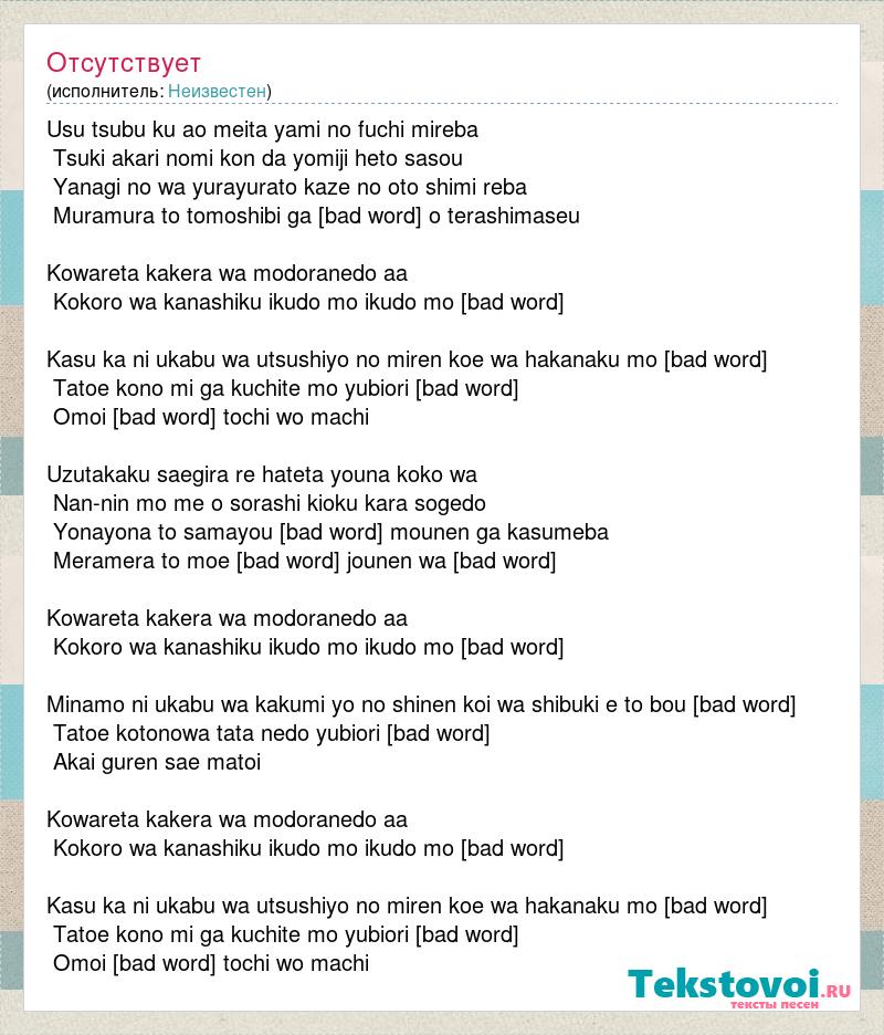 Usu tsubu ku ao meita yami no fuchi mireba Tsuki akari nomi kon da yomiji heto sasou Yanagi no wa yurayurato kaze no oto shimi reba Muramura to tomoshibi ga [bad word] o terashimaseu Kowareta kakera wa modoranedo aa Kokoro wa kanashiku ikudo mo ikudo mo [bad word] Kasu ka ni ukabu wa utsushiyo no miren koe wa hakanaku mo [bad word] Tatoe kono mi ga kuchite mo yubiori [bad word] Omoi [bad word] tochi wo machi Uzutakaku saegira re hateta youna koko wa Nan-nin mo me o sorashi kioku kara sogedo Yonayona to samayou [bad word] mounen ga kasumeba Meramera to moe [bad word] jounen wa [bad word] Kowareta kakera wa modoranedo aa Kokoro wa kanashiku ikudo mo ikudo mo [bad word] Minamo ni ukabu wa kakumi yo no shinen koi wa shibuki e to bou [bad word] Tatoe kotonowa tata nedo yubiori [bad word] Akai guren sae matoi Kowareta kakera wa modoranedo aa Kokoro wa kanashiku ikudo mo ikudo mo [bad word] Kasu ka ni ukabu wa utsushiyo no miren koe wa hakanaku mo [bad word] Tatoe kono mi ga kuchite mo yubiori [bad word] Omoi [bad word] tochi wo machi