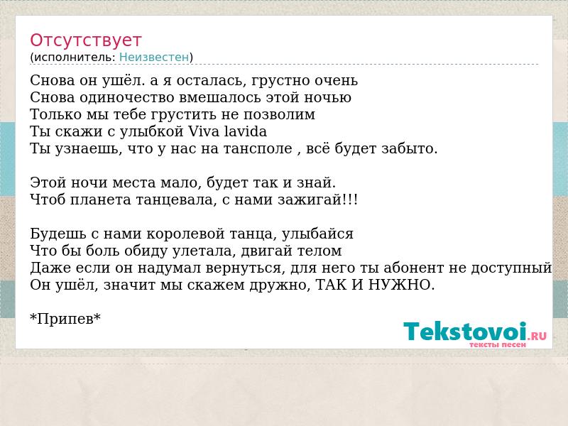 Снова он ушёл. а я осталась, грустно очень Снова одиночество вмешалось этой ночью Только мы тебе грустить не позволим Ты скажи с улыбкой Viva lavida Ты узнаешь, что у нас на тансполе , всё будет забыто. Этой ночи места мало, будет так и знай. Чтоб планета танцевала, с нами зажигай!!! Будешь с нами королевой танца, улыбайся Что бы боль обиду улетала, двигай телом Даже если он надумал вернуться, для него ты абонент не доступный Он ушёл, значит мы скажем дружно, ТАК И НУЖНО. *Припев*