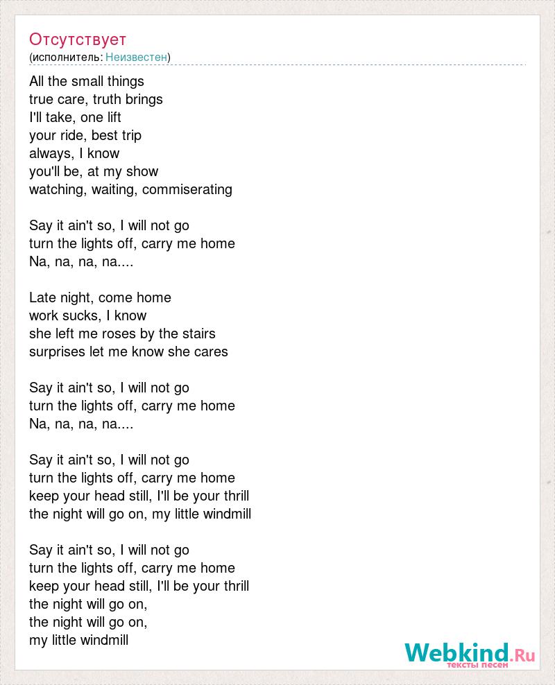 All the small things [bad word] care, [bad word] brings I'll take, one lift your ride, best trip always, I know you'll be, at my show watching, [bad word] Say it ain't so, I will not go turn the lights off, carry me home Na, na, na, na.... Late [bad word] home work sucks, I know she left me roses by the stairs surprises let me know she cares Say it ain't so, I will not go turn the lights off, carry me home Na, na, na, na.... Say it ain't so, I will not go turn the lights off, carry me home keep your head still, I'll be your thrill the night will go on, my little windmill Say it ain't so, I will not go turn the lights off, carry me home keep your head still, I'll be your thrill the night will go on, the night will go on, my little windmill