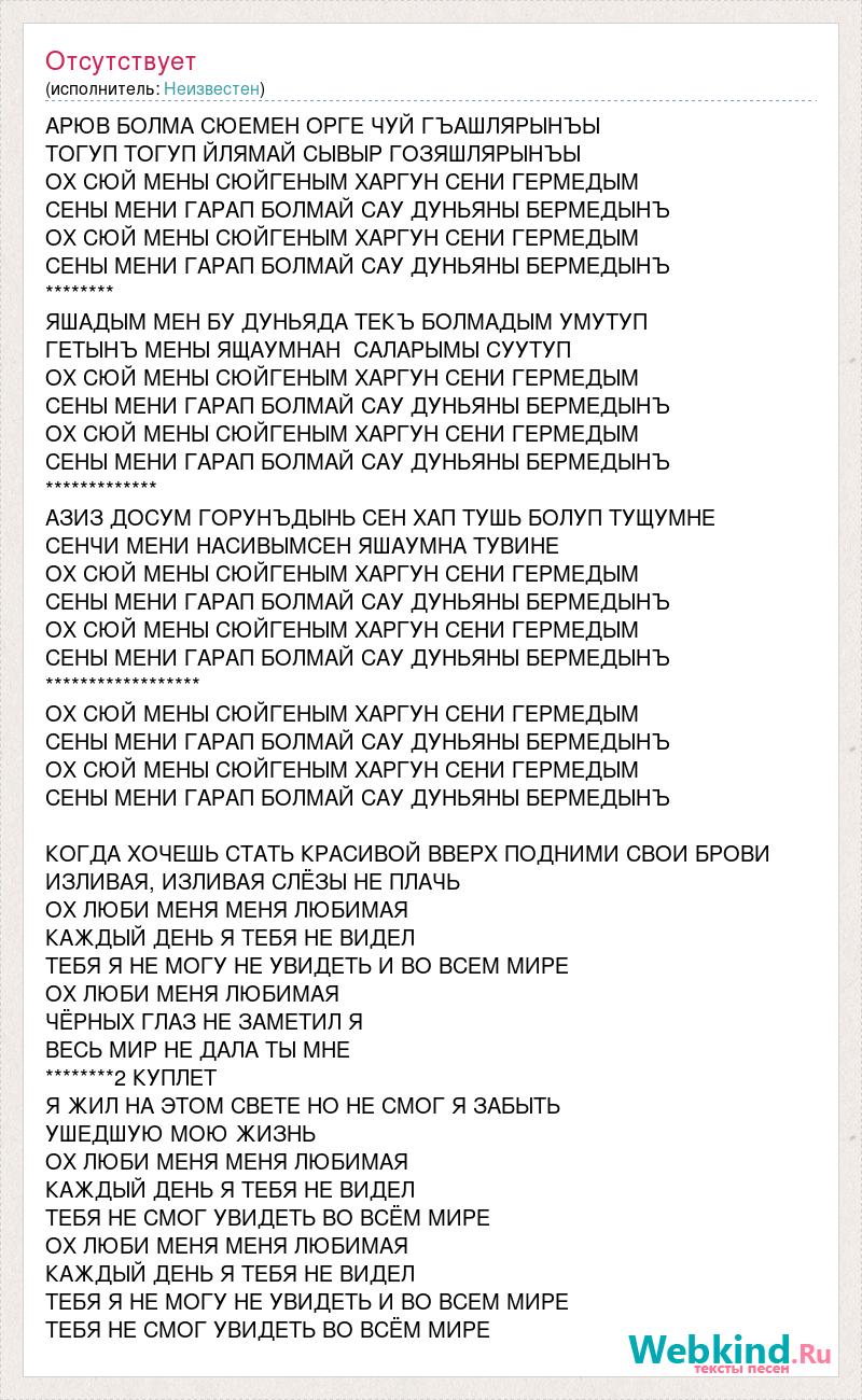 АРЮВ БОЛМА СЮЕМЕН ОРГЕ ЧУЙ ГЪАШЛЯРЫНЪЫ ТОГУП ТОГУП ЙЛЯМАЙ СЫВЫР ГОЗЯШЛЯРЫНЪЫ ОХ СЮЙ МЕНЫ СЮЙГЕНЫМ ХАРГУН СЕНИ ГЕРМЕДЫМ СЕНЫ МЕНИ ГАРАП БОЛМАЙ САУ ДУНЬЯНЫ БЕРМЕДЫНЪ ОХ СЮЙ МЕНЫ СЮЙГЕНЫМ ХАРГУН СЕНИ ГЕРМЕДЫМ СЕНЫ МЕНИ ГАРАП БОЛМАЙ САУ ДУНЬЯНЫ БЕРМЕДЫНЪ ******** ЯШАДЫМ МЕН БУ ДУНЬЯДА ТЕКЪ БОЛМАДЫМ УМУТУП ГЕТЫНЪ МЕНЫ ЯЩАУМНАН САЛАРЫМЫ СУУТУП ОХ СЮЙ МЕНЫ СЮЙГЕНЫМ ХАРГУН СЕНИ ГЕРМЕДЫМ СЕНЫ МЕНИ ГАРАП БОЛМАЙ САУ ДУНЬЯНЫ БЕРМЕДЫНЪ ОХ СЮЙ МЕНЫ СЮЙГЕНЫМ ХАРГУН СЕНИ ГЕРМЕДЫМ СЕНЫ МЕНИ ГАРАП БОЛМАЙ САУ ДУНЬЯНЫ БЕРМЕДЫНЪ ************* АЗИЗ ДОСУМ ГОРУНЪДЫНЬ СЕН ХАП ТУШЬ БОЛУП ТУЩУМНЕ СЕНЧИ МЕНИ НАСИВЫМСЕН ЯШАУМНА ТУВИНЕ ОХ СЮЙ МЕНЫ СЮЙГЕНЫМ ХАРГУН СЕНИ ГЕРМЕДЫМ СЕНЫ МЕНИ ГАРАП БОЛМАЙ САУ ДУНЬЯНЫ БЕРМЕДЫНЪ ОХ СЮЙ МЕНЫ СЮЙГЕНЫМ ХАРГУН СЕНИ ГЕРМЕДЫМ СЕНЫ МЕНИ ГАРАП БОЛМАЙ САУ ДУНЬЯНЫ БЕРМЕДЫНЪ ****************** ОХ СЮЙ МЕНЫ СЮЙГЕНЫМ ХАРГУН СЕНИ ГЕРМЕДЫМ СЕНЫ МЕНИ ГАРАП БОЛМАЙ САУ ДУНЬЯНЫ БЕРМЕДЫНЪ ОХ СЮЙ МЕНЫ СЮЙГЕНЫМ ХАРГУН СЕНИ ГЕРМЕДЫМ СЕНЫ МЕНИ ГАРАП БОЛМАЙ САУ ДУНЬЯНЫ БЕРМЕДЫНЪ КОГДА ХОЧЕШЬ СТАТЬ КРАСИВОЙ ВВЕРХ ПОДНИМИ СВОИ БРОВИ ИЗЛИВАЯ, ИЗЛИВАЯ СЛЁЗЫ НЕ ПЛАЧЬ ОХ ЛЮБИ МЕНЯ МЕНЯ ЛЮБИМАЯ КАЖДЫЙ ДЕНЬ Я ТЕБЯ НЕ ВИДЕЛ ТЕБЯ Я НЕ МОГУ НЕ УВИДЕТЬ И ВО ВСЕМ МИРЕ ОХ ЛЮБИ МЕНЯ ЛЮБИМАЯ ЧЁРНЫХ ГЛАЗ НЕ ЗАМЕТИЛ Я ВЕСЬ МИР НЕ ДАЛА ТЫ МНЕ ********2 КУПЛЕТ Я ЖИЛ НА ЭТОМ СВЕТЕ НО НЕ СМОГ Я ЗАБЫТЬ УШЕДШУЮ МОЮ ЖИЗНЬ ОХ ЛЮБИ МЕНЯ МЕНЯ ЛЮБИМАЯ КАЖДЫЙ ДЕНЬ Я ТЕБЯ НЕ ВИДЕЛ ТЕБЯ НЕ СМОГ УВИДЕТЬ ВО ВСЁМ МИРЕ ОХ ЛЮБИ МЕНЯ МЕНЯ ЛЮБИМАЯ КАЖДЫЙ ДЕНЬ Я ТЕБЯ НЕ ВИДЕЛ ТЕБЯ Я НЕ МОГУ НЕ УВИДЕТЬ И ВО ВСЕМ МИРЕ ТЕБЯ НЕ СМОГ УВИДЕТЬ ВО ВСЁМ МИРЕ