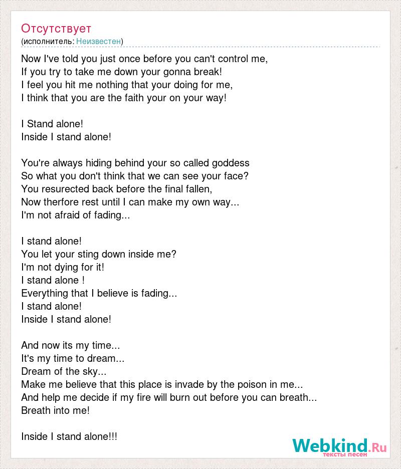 Now I've told you just once before you can't control me, If you try to take me down your gonna break! I feel you hit me nothing that your doing for me, I think that you are the faith your on your way! I Stand alone! Inside I stand alone! You're always hiding behind your so called goddess So what you don't think that we can see your face? You resurected back before the final fallen, Now therfore rest until I can make my own way... I'm not afraid of fading... I stand alone! You let your sting down inside me? I'm not dying for it! I stand alone ! Everything that I believe is fading... I stand alone! Inside I stand alone! And now its my time... It's my time to dream... Dream of the sky... Make me believe that this place is invade by the poison in me... And help me decide if my fire will burn out before you can breath... Breath into me! Inside I stand alone!!!
