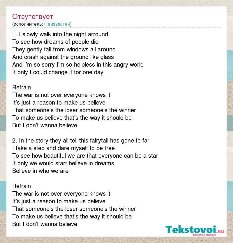 1. I slowly walk into the night arround To see how dreams of people die They gently fall from windows all around And crash against the ground like glass And I’m so sorry I’m so helpless in this angry world If only I could change it for one day Refrain The war is not over everyone knows it It’s just a reason to make us believe That someone’s the loser someone’s the winner To make us believe that’s the way it should be But I don’t wanna believe 2. In the story they all tell this fairytail has gone to far I take a step and dare myself to be free To see how beautiful we are that everyone can be a star If only we would start believe in dreams Believe in who we are Refrain The war is not over everyone knows it It’s just a reason to make us believe That someone’s the loser someone’s the winner To make us believe that’s the way it should be But I don’t wanna believe