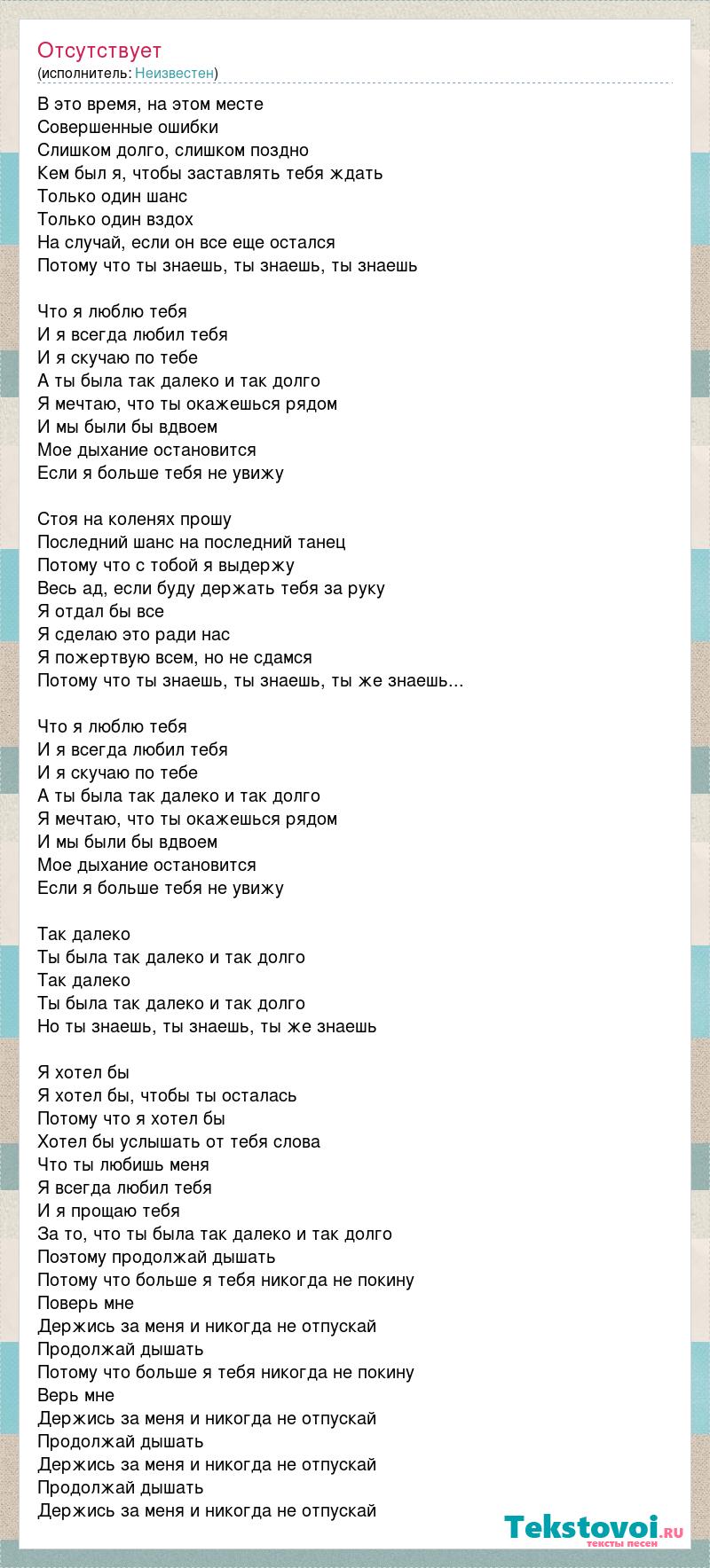 В это время, на этом месте Совершенные ошибки Слишком долго, слишком поздно Кем был я, чтобы заставлять тебя ждать Только один шанс Только один вздох На случай, если он все еще остался Потому что ты знаешь, ты знаешь, ты знаешь Что я люблю тебя И я всегда любил тебя И я скучаю по тебе А ты была так далеко и так долго Я мечтаю, что ты окажешься рядом И мы были бы вдвоем Мое дыхание остановится Если я больше тебя не увижу Стоя на коленях прошу Последний шанс на последний танец Потому что с тобой я выдержу Весь ад, если буду держать тебя за руку Я отдал бы все Я сделаю это ради нас Я пожертвую всем, но не сдамся Потому что ты знаешь, ты знаешь, ты же знаешь... Что я люблю тебя И я всегда любил тебя И я скучаю по тебе А ты была так далеко и так долго Я мечтаю, что ты окажешься рядом И мы были бы вдвоем Мое дыхание остановится Если я больше тебя не увижу Так далеко Ты была так далеко и так долго Так далеко Ты была так далеко и так долго Но ты знаешь, ты знаешь, ты же знаешь Я хотел бы Я хотел бы, чтобы ты осталась Потому что я хотел бы Хотел бы услышать от тебя слова Что ты любишь меня Я всегда любил тебя И я прощаю тебя За то, что ты была так далеко и так долго Поэтому продолжай дышать Потому что больше я тебя никогда не покину Поверь мне Держись за меня и никогда не отпускай Продолжай дышать Потому что больше я тебя никогда не покину Верь мне Держись за меня и никогда не отпускай Продолжай дышать Держись за меня и никогда не отпускай Продолжай дышать Держись за меня и никогда не отпускай
