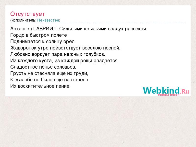 Архангел ГАВРИИЛ: Сильными крыльями воздух рассекая, Гордо в быстром полете Поднимается к солнцу орел. Жаворонок утро приветствует веселою песней. Любовно воркует пара нежных голубков. Из каждого куста, из каждой рощи раздается Сладостное пенье соловьев. Грусть не стесняла еще их груди, К жалобе не было еще настроено Их восхитительное пение.
