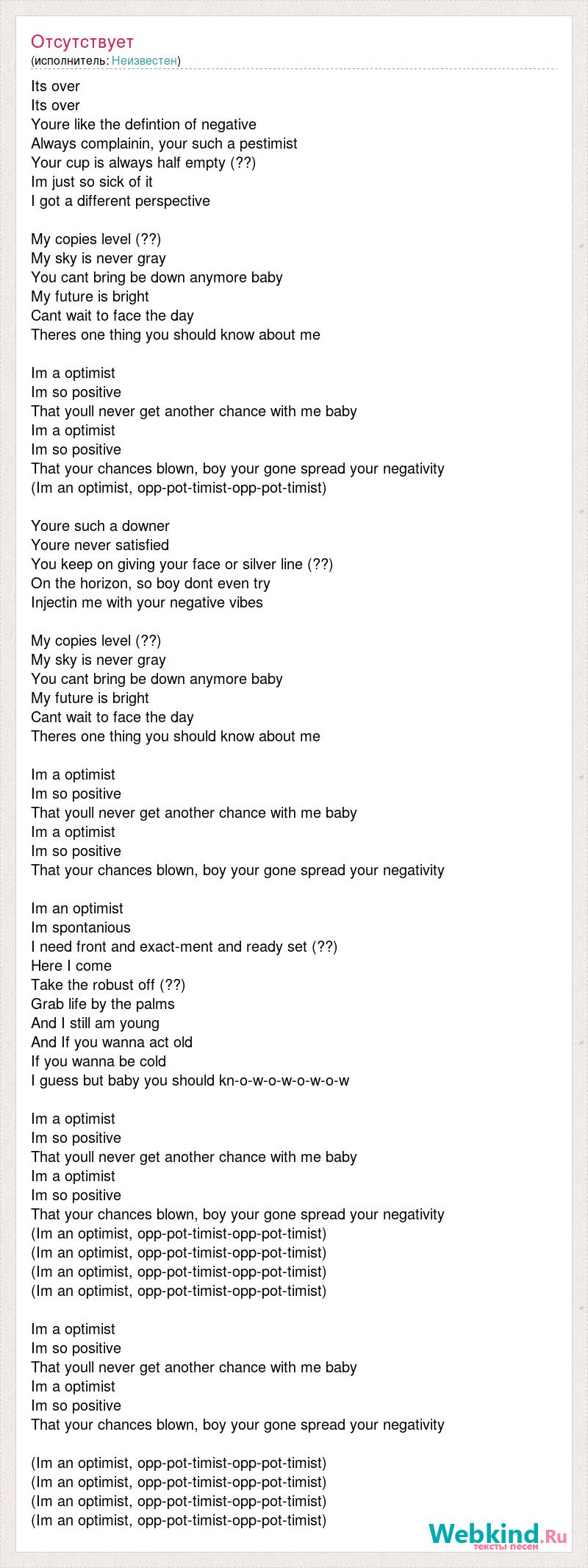 Its over Its over Youre like the defintion of negative [bad word] your such a pestimist Your cup is always half empty (??) Im just so sick of it I got a different perspective My copies level (??) My sky is never gray You cant bring be down anymore baby My future is bright Cant wait to face the day Theres one thing you should know about me Im a optimist Im so positive That youll never get another chance with me baby Im a optimist Im so positive That your chances blown, boy your gone spread your negativity (Im an optimist, opp-pot-timist-opp-pot-timist) Youre such a downer Youre never satisfied You keep on giving your face or silver line (??) On the horizon, so boy dont even try Injectin me with your negative vibes My copies level (??) My sky is never gray You cant bring be down anymore baby My future is bright Cant wait to face the day Theres one thing you should know about me Im a optimist Im so positive That youll never get another chance with me baby Im a optimist Im so positive That your chances blown, boy your gone spread your negativity Im an optimist Im spontanious I need front and exact-ment and ready set (??) Here [bad word] Take the robust off (??) Grab life by the palms And I still am young And If you wanna act old If you wanna be cold I guess but baby you should kn-o-w-o-w-o-w-o-w Im a optimist Im so positive That youll never get another chance with me baby Im a optimist Im so positive That your chances blown, boy your gone spread your negativity (Im an optimist, opp-pot-timist-opp-pot-timist) (Im an optimist, opp-pot-timist-opp-pot-timist) (Im an optimist, opp-pot-timist-opp-pot-timist) (Im an optimist, opp-pot-timist-opp-pot-timist) Im a optimist Im so positive That youll never get another chance with me baby Im a optimist Im so positive That your chances blown, boy your gone spread your negativity (Im an optimist, opp-pot-timist-opp-pot-timist) (Im an optimist, opp-pot-timist-opp-pot-timist) (Im an optimist, opp-pot-timist-opp-pot-timist) (Im an optimist, opp-pot-timist-opp-pot-timist)