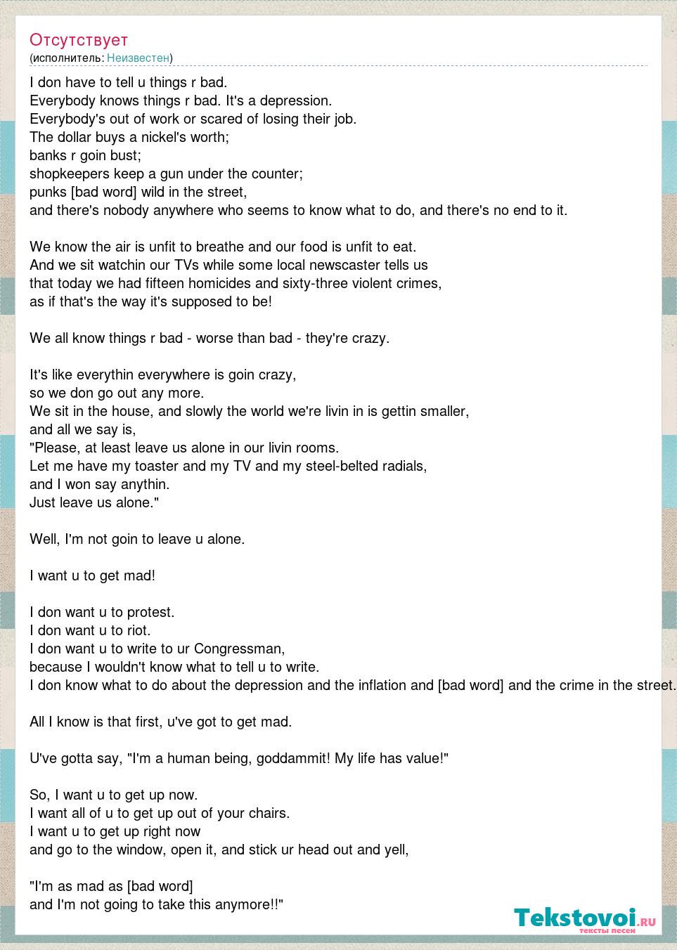 I don have to tell u things r bad. Everybody knows things r bad. It's a depression. Everybody's out of work or scared of losing their job. The dollar buys a nickel's worth; banks r goin bust; shopkeepers keep a gun under the counter; punks [bad word] wild in the street, and there's nobody anywhere who seems to know what to do, and there's no end to it. We know the air is unfit to breathe and our food is unfit to eat. And we sit watchin our TVs while some local newscaster tells us that today we had fifteen homicides and sixty-three violent crimes, as if that's the way it's supposed to be! We all know things r bad - worse than bad - they're crazy. It's like everythin everywhere is goin crazy, so we don go out any more. We sit in the house, and slowly the world we're livin in is gettin smaller, and all we say is, "Please, at least leave us alone in our livin rooms. Let me have my toaster and my TV and my steel-belted radials, and I won say anythin. Just leave us alone." Well, I'm not goin to leave u alone. I want u to get mad! I don want u to protest. I don want u to riot. I don want u to write to ur Congressman, because I wouldn't know what to tell u to write. I don know what to do about the depression and the inflation and [bad word] and the crime in the street. All I know is that first, u've got to get mad. U've gotta say, "I'm a human being, goddammit! My life has value!" So, I want u to get up now. I want all of u to get up out of your chairs. I want u to get up right now and go to the window, open it, and stick ur head out and yell, "I'm as mad as [bad word] and I'm not going to take this anymore!!"
