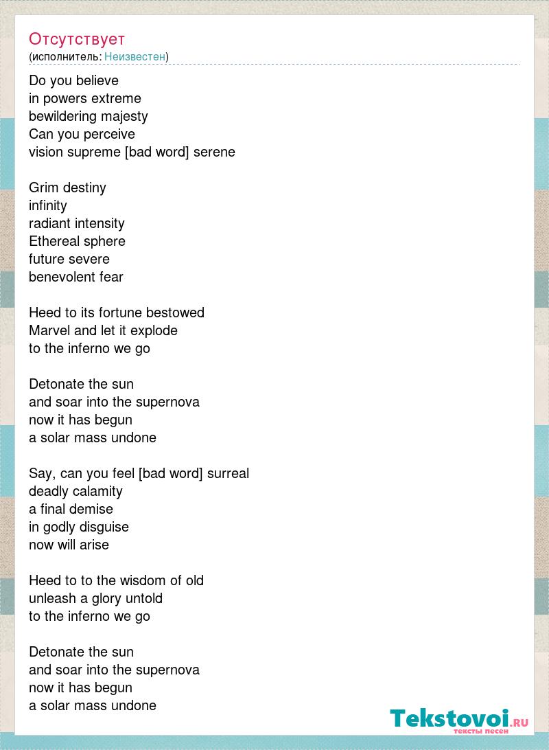 Do you believe in powers extreme bewildering majesty Can you perceive vision supreme [bad word] serene Grim destiny infinity radiant intensity Ethereal sphere future severe benevolent fear Heed to its fortune bestowed Marvel and let it explode to the inferno we go Detonate the sun and soar into the supernova now it has begun a solar mass undone Say, can you feel [bad word] surreal deadly calamity a final demise in godly disguise now will arise Heed to to the wisdom of old unleash a glory untold to the inferno we go Detonate the sun and soar into the supernova now it has begun a solar mass undone