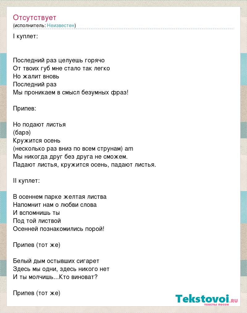 I куплет: Последний раз целуешь горячо От твоих губ мне стало так легко Но жалит вновь Последний раз Мы проникаем в смысл безумных фраз! Припев: Но подают листья (барэ) Кружится осень (несколько раз вниз по всем струнам) am Мы никогда друг без друга не сможем. Падают листья, кружится осень, падают листья. II куплет: В осеннем парке желтая листва Напомнит нам о любви слова И вспомнишь ты Под той листвой Осенней познакомились порой! Припев (тот же) Белый дым остывших сигарет Здесь мы одни, здесь никого нет И ты молчишь...Кто виноват? Припев (тот же)