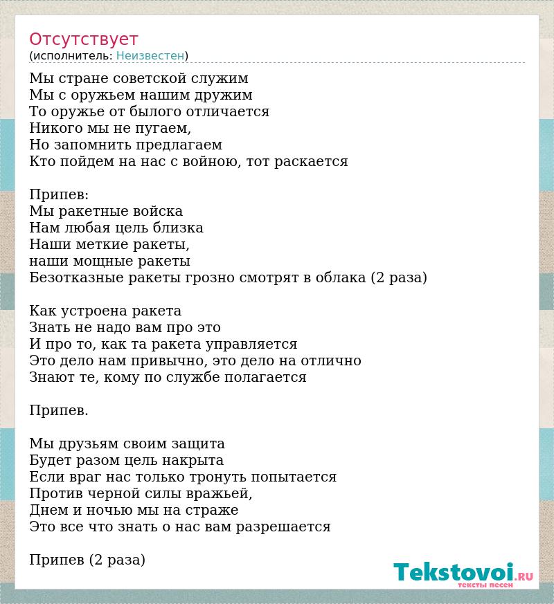 Мы стране советской служим Мы с оружьем нашим дружим То оружье от былого отличается Никого мы не пугаем, Но запомнить предлагаем Кто пойдем на нас с войною, тот раскается Припев: Мы ракетные войска Нам любая цель близка Наши меткие ракеты, наши мощные ракеты Безотказные ракеты грозно смотрят в облака (2 раза) Как устроена ракета Знать не надо вам про это И про то, как та ракета управляется Это дело нам привычно, это дело на отлично Знают те, кому по службе полагается Припев. Мы друзьям своим защита Будет разом цель накрыта Если враг нас только тронуть попытается Против черной силы вражьей, Днем и ночью мы на страже Это все что знать о нас вам разрешается Припев (2 раза)