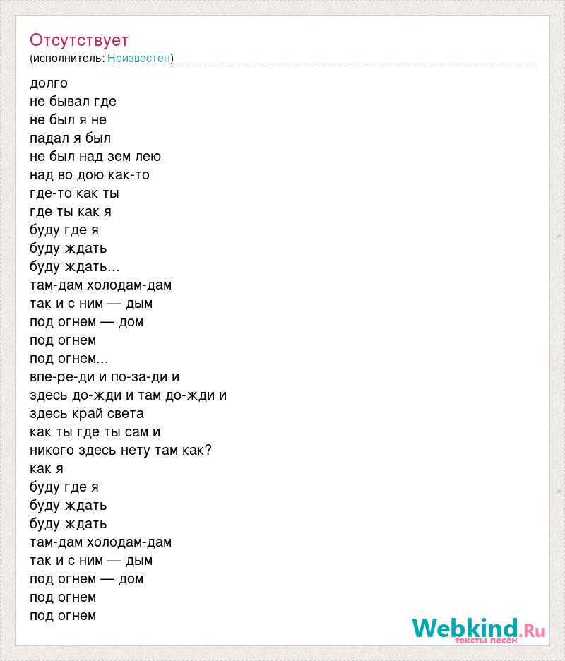 долго не бывал где не был я не падал я был не был над зем лею над во дою как-то где-то как ты где ты как я буду где я буду ждать буду ждать... там-дам холодам-дам так и с ним — дым под огнем — дом под огнем под огнем... впе-ре-ди и по-за-ди и здесь до-жди и там до-жди и здесь край света как ты где ты сам и никого здесь нету там как? как я буду где я буду ждать буду ждать там-дам холодам-дам так и с ним — дым под огнем — дом под огнем под огнем