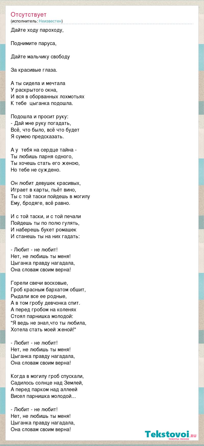 Дайте ходу пароходу, Поднимите паруса, Дайте мальчику свободу За красивые глаза. А ты сидела и мечтала У раскрытого окна, И вся в оборванных лохмотьях К тебе цыганка подошла. Подошла и просит руку: - Дай мне руку погадать, Всё, что было, всё что будет Я сумею предсказать. А у тебя на сердце тайна - Ты любишь парня одного, Ты хочешь стать его женою, Но тебе не суждено. Он любит девушек красивых, Играет в карты, пьёт вино, Ты с той таски пойдешь в могилу Ему, бродяге, всё равно. И с той таски, и с той печали Пойдешь ты по полю гулять, И наберешь букет ромашек И станешь ты на них гадать: - Любит - не любит! Нет, не любишь ты меня! Цыганка правду нагадала, Она словам своим верна! Горели свечи восковые, Гроб красным бархатом обшит, Рыдали все ее родные, А в том гробу девчонка спит. А перед гробом на коленях Стоял парнишка молодой: "Я ведь не знал,что ты любила, Хотела стать моей женой!" - Любит - не любит! Нет, не любишь ты меня! Цыганка правду нагадала, Она словам своим верна! Когда в могилу гроб спускали, Садилось солнце над Землей, А перед парком над аллеей Висел парнишка молодой... - Любит - не любит! Нет, не любишь ты меня! Цыганка правду нагадала, Она словам своим верна!
