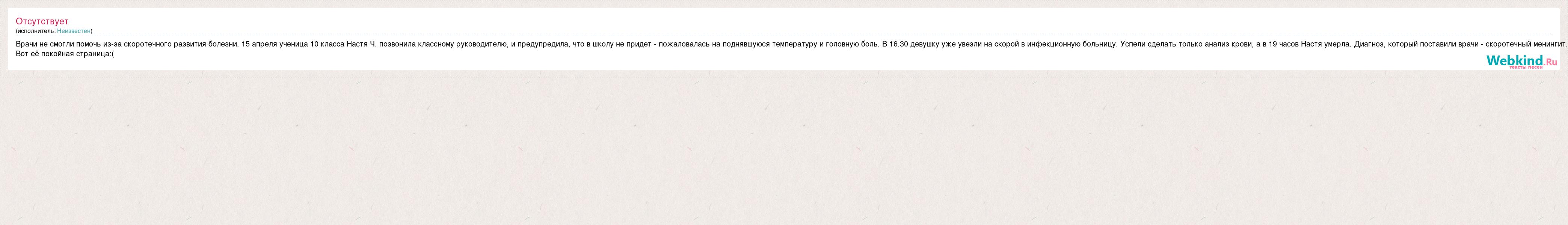 Врачи не смогли помочь из-за скоротечного развития болезни. 15 апреля ученица 10 класса Настя Ч. позвонила классному руководителю, и предупредила, что в школу не придет - пожаловалась на поднявшуюся температуру и головную боль. В 16.30 девушку уже увезли на скорой в инфекционную больницу. Успели сделать только анализ крови, а в 19 часов Настя умерла. Диагноз, который поставили врачи - скоротечный менингит.