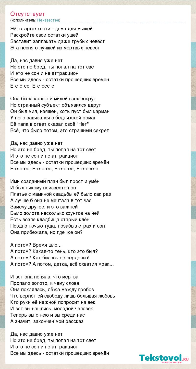 Эй, старые кости - дома для мышей Раскройте свои остатки ушей Заставит заплакать даже грубых невест Эта песня о лучшей из мёртвых невест Да, нас давно уже нет Но это не бред, ты попал на тот свет И это не сон и не аттракцион Все мы здесь - остатки прошедших времен Е-е-е-ее, Е-е-еее-е Она была краше и милей всех вокруг Но странный субъект объявился вдруг Он был мил, изящен, хоть пуст был карман У него завязался с бедняжкой роман Её папа в ответ сказал своё "Нет" Всё, что было потом, это страшный секрет Да, нас давно уже нет Но это не бред, ты попал на тот свет И это не сон и не аттракцион Все мы здесь - остатки прошедших времён Е-е-е-ее, Е-е-е-ее, Е-е-е-ее, Е-е-еее-е Ими созданный план был прост и умён И был никому неизвестен он Платье с маминой свадьбы ей было как раз А лучше б она не мечтала в тот час Замечу другое, и это важней Было золота несколько фунтов на ней Есть возле кладбища старый клён Поздно ночью туда, позабыв страх и сон Она прибежала, но где же он? А потом? Время шло... А потом? Какая-то тень, кто это был? А потом? Как билось её сердечко! А потом? А потом, детка, всё охватил мрак... И вот она поняла, что мертва Пропало золото, к чему слова Она поклялась, лёжа между гробов Что вернёт ей свободу лишь большая любовь Кто руки её нежной попросит на век И вот вы нашлись, молодой человек Теперь вы с нею и вы среди нас А значит, закончен мой рассказ Да, нас давно уже нет Но это не бред, ты попал на тот свет И это не сон и не аттракцион Все мы здесь - остатки прошедших времён