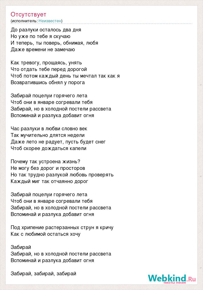 До разлуки осталось два дня Но уже по тебе я скучаю И теперь, ты поверь, обнимая, любя Даже времени не замечаю Как тревогу, прощаясь, унять Что отдать тебе перед дорогой Чтоб потом каждый день ты мечтал так как я Возвратившись обнял у порога Забирай поцелуи горячего лета Чтоб они в январе согревали тебя Забирай, но в холодной постели рассвета Вспоминай и разлука добавит огня Час разлуки в любви словно век Так мучительно длятся недели Даже лето не радует, пусть будет снег Чтоб скорее дождаться капели Почему так устроена жизнь? Не могу без дорог и просторов Но так трудно разлукой любовь проверять Каждый миг так отчаянно дорог Забирай поцелуи горячего лета Чтоб они в январе согревали тебя Забирай, но в холодной постели рассвета Вспоминай и разлука добавит огня Под хрипение растерзанных струн я кричу Как с любимой остаться хочу Забирай Забирай, но в холодной постели рассвета Вспоминай и разлука добавит огня Забирай, забирай, забирай