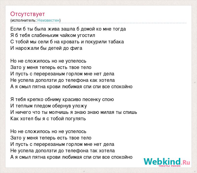 Если б ты была жива зашла б домой ко мне тогда Я б тебя слабеньким чайком угостил С тобой мы сели б на кровать и покурили табака И нарожали бы детей до фига Но не сложилось но не успелось Зато у меня теперь есть твое тело И пусть с перерезаным горлом мне нет дела Не успела доползти до телефона как хотела А я смыл пятна крови любимая спи спи все спокойно Я тебя крепко обниму красиво песенку спою И теплым пледом обернув уложу И ничего что ты молчишь я знаю знаю милая ты спишь Как хотел бы я с тобой погулять Но не сложилось но не успелось Зато у меня теперь есть твое тело И пусть с перерезаным горлом мне нет дела Не успела доползти до телефона так хотела А я смыл пятна крови любимая спи спи все спокойно