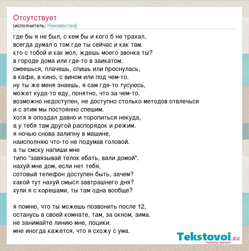 где бы я не был, с кем бы и кого б не трахал, всегда думал о том где ты сейчас и как там. кто с тобой и как мол, ждешь моего звонка ты? в городе дома или где-то в заикатом. смеешься, плачешь, спишь или проснулась, в кафе, в кино, с вином или под чем-то. ну ты же меня знаешь, я сам где-то тусуюсь, может куда-то еду, понятно, что за чем-то. возможно недоступен, не доступно столько методов отвлечься и с этим мы постоянно спешим. хотя я опоздал давно и торопиться некуда, а у тебя там другой распорядок и режим. я ночью снова залипну в машине, наисполняю что-то не подумав головой. а ты смску напиши мне типо "завязывай телок ебать, вали домой". нахуй мне дом, если нет тебя, сотовый телефон доступен быть, зачем? какой тут нахуй смысл завтрашнего дня? хули я с корешами, ты там одна вообще? я помню, что ты можешь позвонить после 12, останусь в своей комнате, там, за окном, зима. не занимайте линию мне, поцики. мне иногда кажется, что я схожу с ума.
