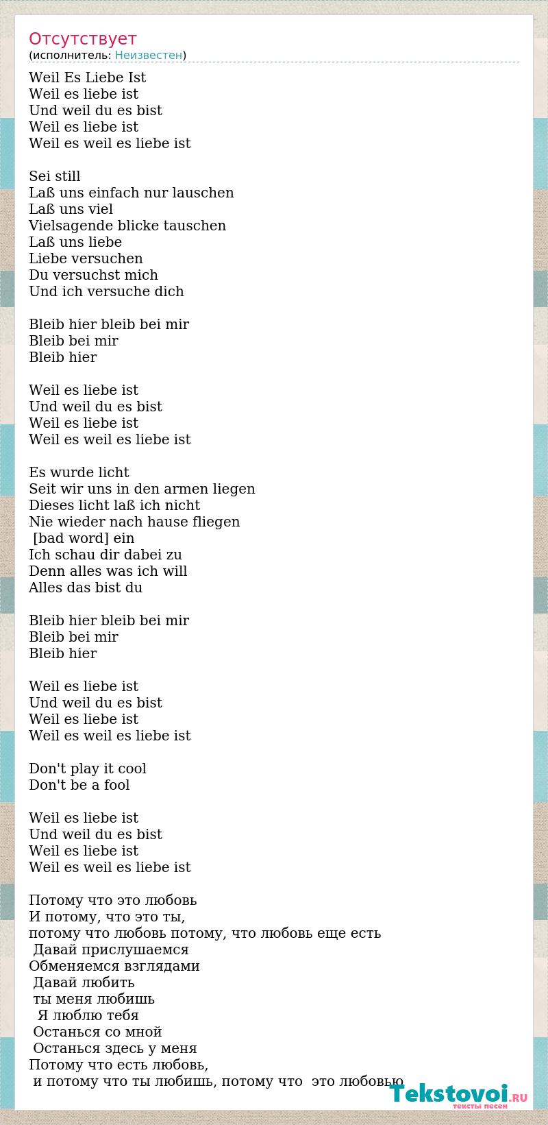 Weil Es Liebe Ist Weil es liebe ist Und weil du es bist Weil es liebe ist Weil es weil es liebe ist Sei still Laß uns einfach nur lauschen Laß uns viel Vielsagende blicke tauschen Laß uns liebe Liebe versuchen Du versuchst mich Und ich versuche dich Bleib hier bleib bei mir Bleib bei mir Bleib hier Weil es liebe ist Und weil du es bist Weil es liebe ist Weil es weil es liebe ist Es wurde licht Seit wir uns in den armen liegen Dieses licht laß ich nicht Nie wieder nach hause fliegen [bad word] ein Ich schau dir dabei zu Denn alles was ich will Alles das bist du Bleib hier bleib bei mir Bleib bei mir Bleib hier Weil es liebe ist Und weil du es bist Weil es liebe ist Weil es weil es liebe ist Don't play it cool Don't be a fool Weil es liebe ist Und weil du es bist Weil es liebe ist Weil es weil es liebe ist Потому что это любовь И потому, что это ты, потому что любовь потому, что любовь еще есть Давай прислушаемся Обменяемся взглядами Давай любить ты меня любишь Я люблю тебя Останься со мной Останься здесь у меня Потому что есть любовь, и потому что ты любишь, потому что это любовью