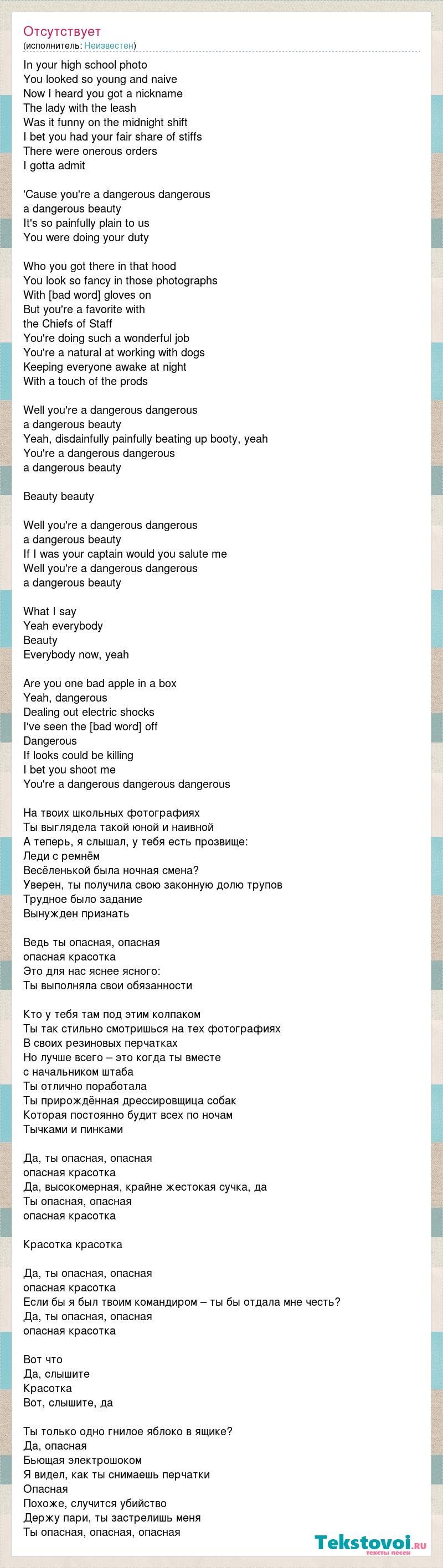 In your high school photo You looked so young and naive Now I heard you got a nickname The lady with the leash Was it funny on the midnight shift I bet you had your fair share of stiffs There were onerous orders I gotta admit 'Cause you're a dangerous dangerous a dangerous beauty It's so painfully plain to us You were doing your duty Who you got there in that hood You look so fancy in those photographs With [bad word] gloves on But you're a favorite with the Chiefs of Staff You're doing such a wonderful job You're a natural at working with dogs Keeping everyone awake at night With a touch of the prods Well you're a dangerous dangerous a dangerous beauty Yeah, disdainfully painfully beating up booty, yeah You're a dangerous dangerous a dangerous beauty Beauty beauty Well you're a dangerous dangerous a dangerous beauty If I was your captain would you salute me Well you're a dangerous dangerous a dangerous beauty What I say Yeah everybody Beauty Everybody now, yeah Are you one bad apple in a box Yeah, dangerous Dealing out electric shocks I've seen the [bad word] off Dangerous If looks could be killing I bet you shoot me You're a dangerous dangerous dangerous На твоих школьных фотографиях Ты выглядела такой юной и наивной А теперь, я слышал, у тебя есть прозвище: Леди с ремнём Весёленькой была ночная смена? Уверен, ты получила свою законную долю трупов Трудное было задание Вынужден признать Ведь ты опасная, опасная опасная красотка Это для нас яснее ясного: Ты выполняла свои обязанности Кто у тебя там под этим колпаком Ты так стильно смотришься на тех фотографиях В своих резиновых перчатках Но лучше всего – это когда ты вместе с начальником штаба Ты отлично поработала Ты прирождённая дрессировщица собак Которая постоянно будит всех по ночам Тычками и пинками Да, ты опасная, опасная опасная красотка Да, высокомерная, крайне жестокая сучка, да Ты опасная, опасная опасная красотка Красотка красотка Да, ты опасная, опасная опасная красотка Если бы я был твоим командиром – ты бы отдала мне честь? Да, ты опасная, опасная опасная красотка Вот что Да, слышите Красотка Вот, слышите, да Ты только одно гнилое яблоко в ящике? Да, опасная Бьющая электрошоком Я видел, как ты снимаешь перчатки Опасная Похоже, случится убийство Держу пари, ты застрелишь меня Ты опасная, опасная, опасная
