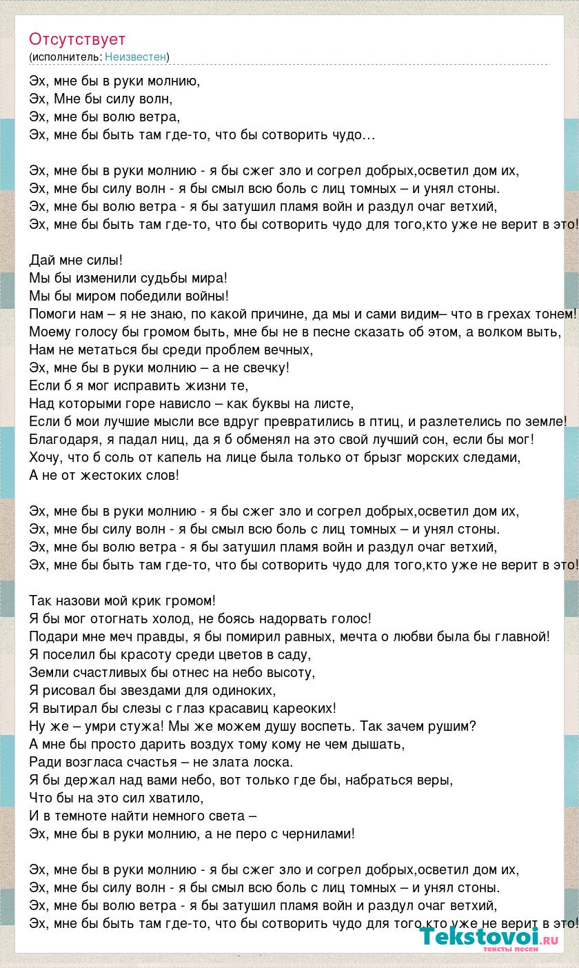 Эх, мне бы в руки молнию, Эх, Мне бы силу волн, Эх, мне бы волю ветра, Эх, мне бы быть там где-то, что бы сотворить чудо… Эх, мне бы в руки молнию - я бы сжег зло и согрел добрых,осветил дом их, Эх, мне бы силу волн - я бы смыл всю боль с лиц томных – и унял стоны. Эх, мне бы волю ветра - я бы затушил пламя войн и раздул очаг ветхий, Эх, мне бы быть там где-то, что бы сотворить чудо для того,кто уже не верит в это! Дай мне силы! Мы бы изменили судьбы мира! Мы бы миром победили войны! Помоги нам – я не знаю, по какой причине, да мы и сами видим– что в грехах тонем! Моему голосу бы громом быть, мне бы не в песне сказать об этом, а волком выть, Нам не метаться бы среди проблем вечных, Эх, мне бы в руки молнию – а не свечку! Если б я мог исправить жизни те, Над которыми горе нависло – как буквы на листе, Если б мои лучшие мысли все вдруг превратились в птиц, и разлетелись по земле! Благодаря, я падал ниц, да я б обменял на это свой лучший сон, если бы мог! Хочу, что б соль от капель на лице была только от брызг морских следами, А не от жестоких слов! Эх, мне бы в руки молнию - я бы сжег зло и согрел добрых,осветил дом их, Эх, мне бы силу волн - я бы смыл всю боль с лиц томных – и унял стоны. Эх, мне бы волю ветра - я бы затушил пламя войн и раздул очаг ветхий, Эх, мне бы быть там где-то, что бы сотворить чудо для того,кто уже не верит в это! Так назови мой крик громом! Я бы мог отогнать холод, не боясь надорвать голос! Подари мне меч правды, я бы помирил равных, мечта о любви была бы главной! Я поселил бы красоту среди цветов в саду, Земли счастливых бы отнес на небо высоту, Я рисовал бы звездами для одиноких, Я вытирал бы слезы с глаз красавиц кареоких! Ну же – умри стужа! Мы же можем душу воспеть. Так зачем рушим? А мне бы просто дарить воздух тому кому не чем дышать, Ради возгласа счастья – не злата лоска. Я бы держал над вами небо, вот только где бы, набраться веры, Что бы на это сил хватило, И в темноте найти немного света – Эх, мне бы в руки молнию, а не перо с чернилами! Эх, мне бы в руки молнию - я бы сжег зло и согрел добрых,осветил дом их, Эх, мне бы силу волн - я бы смыл всю боль с лиц томных – и унял стоны. Эх, мне бы волю ветра - я бы затушил пламя войн и раздул очаг ветхий, Эх, мне бы быть там где-то, что бы сотворить чудо для того,кто уже не верит в это!
