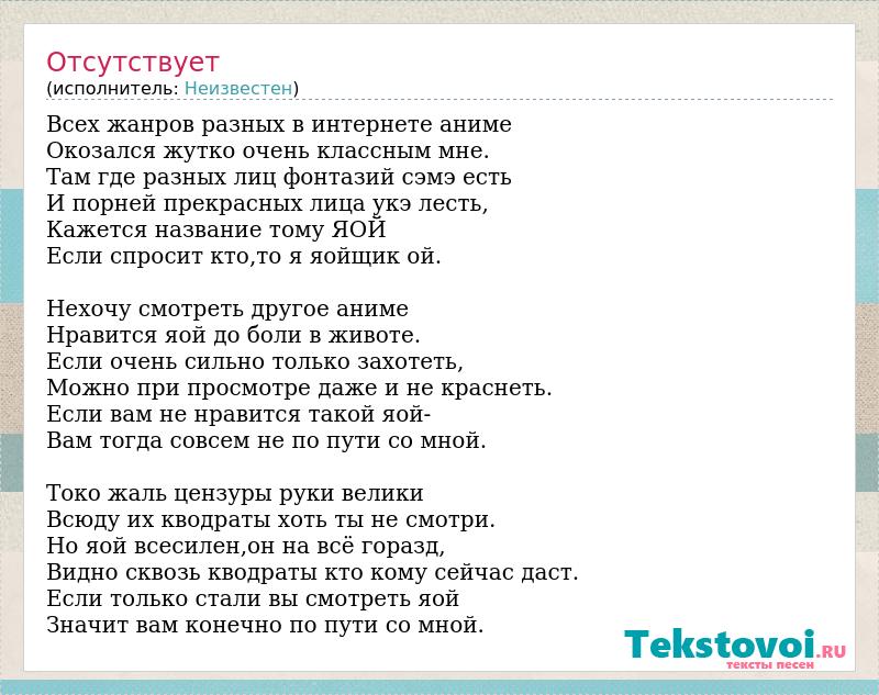 Всех жанров разных в интернете аниме Окозался жутко очень классным мне. Там где разных лиц фонтазий сэмэ есть И порней прекрасных лица укэ лесть, Кажется название тому ЯОЙ Если спросит кто,то я яойщик ой. Нехочу смотреть другое аниме Нравится яой до боли в животе. Если очень сильно только захотеть, Можно при просмотре даже и не краснеть. Если вам не нравится такой яой- Вам тогда совсем не по пути со мной. Токо жаль цензуры руки велики Всюду их кводраты хоть ты не смотри. Но яой всесилен,он на всё горазд, Видно сквозь кводраты кто кому сейчас даст. Если только стали вы смотреть яой Значит вам конечно по пути со мной.