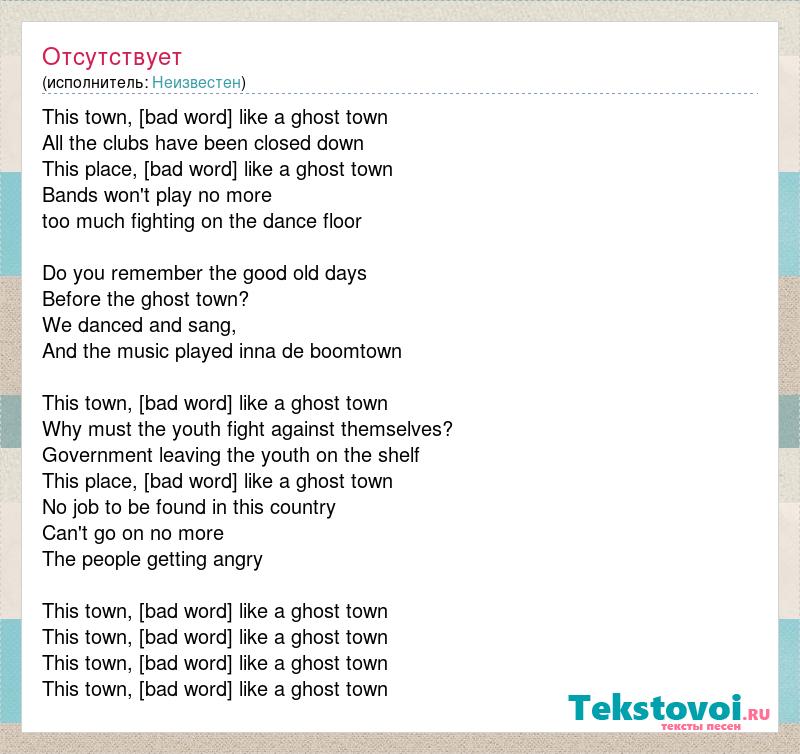 This town, [bad word] like a ghost town All the clubs have been closed down This place, [bad word] like a ghost town Bands won't play no more too much fighting on the dance floor Do you remember the good old days Before the ghost town? We danced and sang, And the music played inna de boomtown This town, [bad word] like a ghost town Why must the youth fight against themselves? Government leaving the youth on the shelf This place, [bad word] like a ghost town No job to be found in this country Can't go on no more The people getting angry This town, [bad word] like a ghost town This town, [bad word] like a ghost town This town, [bad word] like a ghost town This town, [bad word] like a ghost town