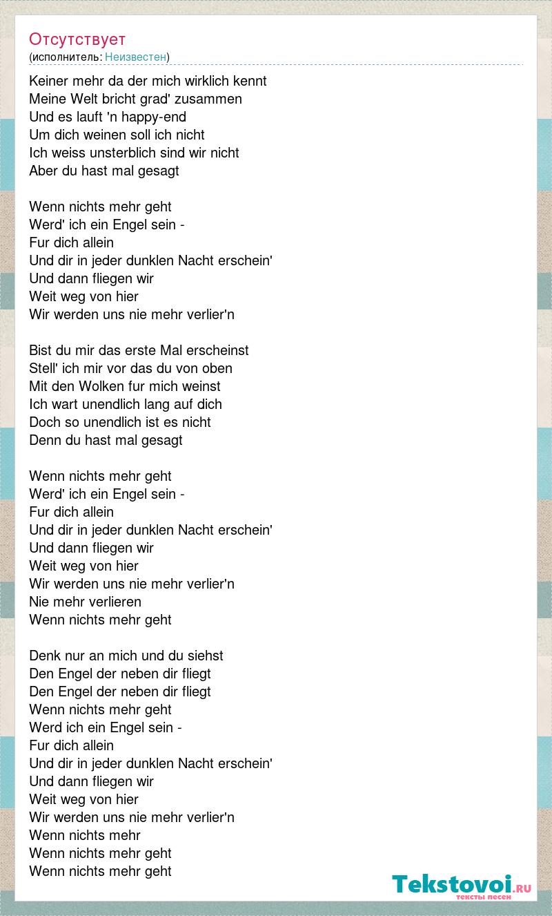 Keiner mehr da der mich wirklich kennt Meine Welt bricht grad' zusammen Und es lauft 'n happy-end Um dich weinen soll ich nicht Ich weiss unsterblich sind wir nicht Aber du hast mal gesagt Wenn nichts mehr geht Werd' ich ein Engel sein - Fur dich allein Und dir in jeder dunklen Nacht erschein' Und dann fliegen wir Weit weg von hier Wir werden uns nie mehr verlier'n Bist du mir das erste Mal erscheinst Stell' ich mir vor das du von oben Mit den Wolken fur mich weinst Ich wart unendlich lang auf dich Doch so unendlich ist es nicht Denn du hast mal gesagt Wenn nichts mehr geht Werd' ich ein Engel sein - Fur dich allein Und dir in jeder dunklen Nacht erschein' Und dann fliegen wir Weit weg von hier Wir werden uns nie mehr verlier'n Nie mehr verlieren Wenn nichts mehr geht Denk nur an mich und du siehst Den Engel der neben dir fliegt Den Engel der neben dir fliegt Wenn nichts mehr geht Werd ich ein Engel sein - Fur dich allein Und dir in jeder dunklen Nacht erschein' Und dann fliegen wir Weit weg von hier Wir werden uns nie mehr verlier'n Wenn nichts mehr Wenn nichts mehr geht Wenn nichts mehr geht