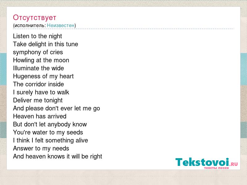 Listen to the night Take delight in this tune symphony of cries Howling at the moon Illuminate the wide Hugeness of my heart The corridor inside I surely have to walk Deliver me tonight And please don't ever let me go Heaven has arrived But don't let anybody know You're water to my seeds I think I felt something alive Answer to my needs And heaven knows it will be right