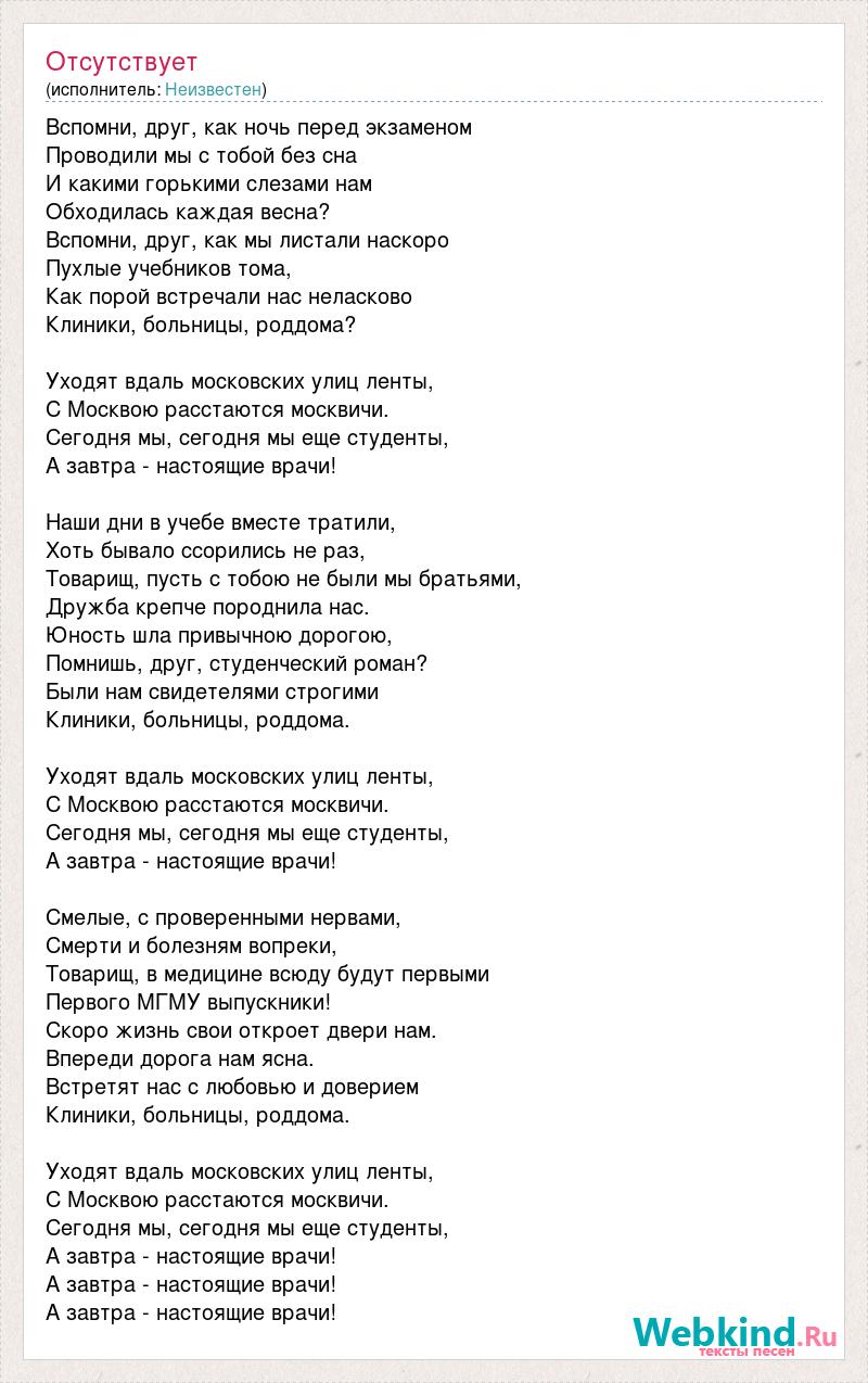 Вспомни, друг, как ночь перед экзаменом Проводили мы с тобой без сна И какими горькими слезами нам Обходилась каждая весна? Вспомни, друг, как мы листали наскоро Пухлые учебников тома, Как порой встречали нас неласково Клиники, больницы, роддома? Уходят вдаль московских улиц ленты, С Москвою расстаются москвичи. Сегодня мы, сегодня мы еще студенты, А завтра - настоящие врачи! Наши дни в учебе вместе тратили, Хоть бывало ссорились не раз, Товарищ, пусть с тобою не были мы братьями, Дружба крепче породнила нас. Юность шла привычною дорогою, Помнишь, друг, студенческий роман? Были нам свидетелями строгими Клиники, больницы, роддома. Уходят вдаль московских улиц ленты, С Москвою расстаются москвичи. Сегодня мы, сегодня мы еще студенты, А завтра - настоящие врачи! Смелые, с проверенными нервами, Смерти и болезням вопреки, Товарищ, в медицине всюду будут первыми Первого МГМУ выпускники! Скоро жизнь свои откроет двери нам. Впереди дорога нам ясна. Встретят нас с любовью и доверием Клиники, больницы, роддома. Уходят вдаль московских улиц ленты, С Москвою расстаются москвичи. Сегодня мы, сегодня мы еще студенты, А завтра - настоящие врачи! А завтра - настоящие врачи! А завтра - настоящие врачи!