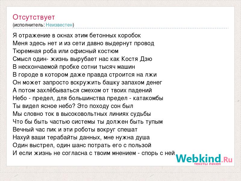 Я отражение в окнах этим бетонных коробок Меня здесь нет и из сети давно выдернут провод Тюремная роба или офисный костюм Смысл один- жизнь вырубает нас как Костя Дзю В нескончаемой пробке сотни тысяч машин В городе в котором даже правда строится на лжи Он может запросто вскружить башку запахом денег А потом захлёбываться смехом от твоих падений Небо - предел, для большинства предел - катакомбы Ты видел ясное небо? Это походу сон был Мы словно ток в высоковольтных линиях судьбы Что бы быть частью системы ты должен быть тупым Вечный час пик и эти роботы вокруг спешат Нахуй ваши терабайты данных, мне нужна душа Один выстрел, один шанс потрать его с пользой И если жизнь не согласна с твоим мнением - спорь с ней