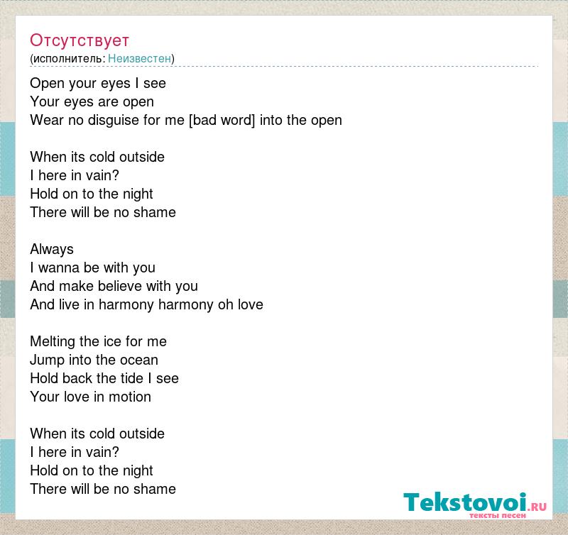 Open your eyes I see Your eyes are open Wear no disguise for me [bad word] into the open When its cold outside I here in vain? Hold on to the night There will be no shame Always I wanna be with you And make believe with you And live in harmony harmony oh love Melting the ice for me Jump into the ocean Hold back the tide I see Your love in motion When its cold outside I here in vain? Hold on to the night There will be no shame