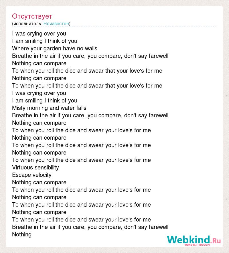I was crying over you I am smiling I think of you Where your garden have no walls Breathe in the air if you care, [bad word] don't say farewell Nothing [bad word] To when you roll the dice and swear that your love's for me Nothing [bad word] To when you roll the dice and swear that your love's for me I was crying over you I am smiling I think of you Misty morning and water falls Breathe in the air if you care, [bad word] don't say farewell Nothing [bad word] To when you roll the dice and swear your love's for me Nothing [bad word] To when you roll the dice and swear your love's for me Nothing [bad word] To when you roll the dice and swear your love's for me Virtuous sensibility Escape velocity Nothing [bad word] To when you roll the dice and swear your love's for me Nothing [bad word] To when you roll the dice and swear your love's for me Nothing [bad word] To when you roll the dice and swear your love's for me Breathe in the air if you care, [bad word] don't say farewell Nothing
