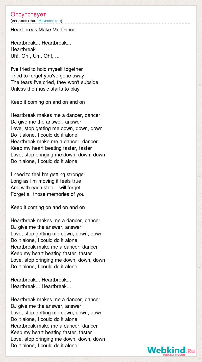 Heart break Make Me Dance Heartbreak... Heartbreak... Heartbreak... Uh!, Oh!, Uh!, Oh!, ... I've tried to hold myself together Tried to forget you've gone away The tears I've cried, they won't subside Unless the music starts to play Keep [bad word] on and on and on Heartbreak makes me a dancer, dancer DJ give me the answer, answer Love, stop getting me down, down, down Do it alone, I could do it alone Heartbreak make me a dancer, dancer Keep my heart beating faster, faster Love, stop bringing me down, down, down Do it alone, I could do it alone I need to feel I'm getting stronger Long as I'm moving it feels [bad word] And with each step, I will forget Forget all those memories of you Keep [bad word] on and on and on Heartbreak makes me a dancer, dancer DJ give me the answer, answer Love, stop getting me down, down, down Do it alone, I could do it alone Heartbreak make me a dancer, dancer Keep my heart beating faster, faster Love, stop bringing me down, down, down Do it alone, I could do it alone Heartbreak... Heartbreak... Heartbreak... Heartbreak... Heartbreak makes me a dancer, dancer DJ give me the answer, answer Love, stop getting me down, down, down Do it alone, I could do it alone Heartbreak make me a dancer, dancer Keep my heart beating faster, faster Love, stop bringing me down, down, down Do it alone, I could do it alone