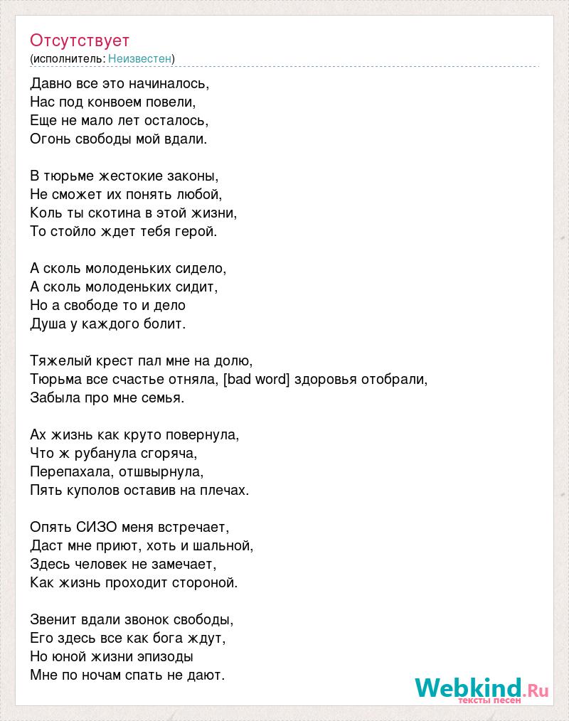 Давно все это начиналось, Нас под конвоем повели, Еще не мало лет осталось, Огонь свободы мой вдали. В тюрьме жестокие законы, Не сможет их понять любой, Коль ты скотина в этой жизни, То стойло ждет тебя герой. А сколь молоденьких сидело, А сколь молоденьких сидит, Но а свободе то и дело Душа у каждого болит. Тяжелый крест пал мне на долю, Тюрьма все счастье отняла, [bad word] здоровья отобрали, Забыла про мне семья. Ах жизнь как круто повернула, Что ж рубанула сгоряча, Перепахала, отшвырнула, Пять куполов оставив на плечах. Опять СИЗО меня встречает, Даст мне приют, хоть и шальной, Здесь человек не замечает, Как жизнь проходит стороной. Звенит вдали звонок свободы, Его здесь все как бога ждут, Но юной жизни эпизоды Мне по ночам спать не дают.