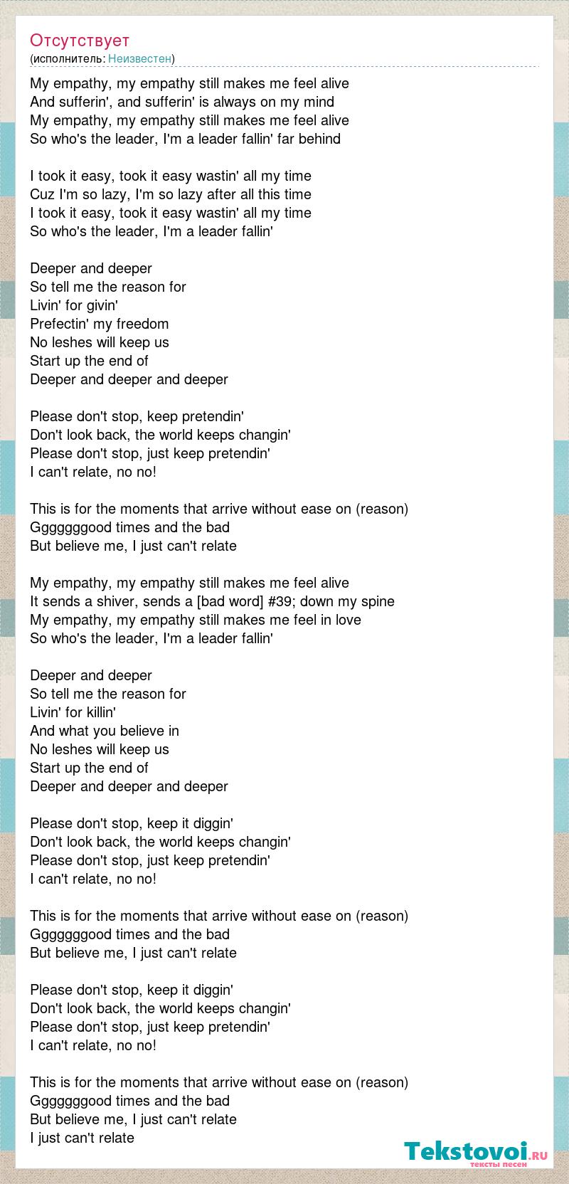 My empathy, my empathy still makes me feel alive And sufferin', and sufferin' is always on my mind My empathy, my empathy still makes me feel alive So who's the leader, I'm a leader fallin' far behind I took it easy, took it easy wastin' all my time Cuz I'm so lazy, I'm so lazy after all this time I took it easy, took it easy wastin' all my time So who's the leader, I'm a leader fallin' Deeper and deeper So tell me the reason for Livin' for givin' Prefectin' my freedom No leshes will keep us Start up the end of Deeper and deeper and deeper Please don't stop, keep pretendin' Don't look back, the world keeps changin' Please don't stop, just keep pretendin' I can't relate, no no! This is for the moments that arrive without ease on (reason) Gggggggood times and the bad But believe me, I just can't relate My empathy, my empathy still makes me feel alive It sends a shiver, sends a [bad word] #39; down my spine My empathy, my empathy still makes me feel in love So who's the leader, I'm a leader fallin' Deeper and deeper So tell me the reason for Livin' for killin' And what you believe in No leshes will keep us Start up the end of Deeper and deeper and deeper Please don't stop, keep it diggin' Don't look back, the world keeps changin' Please don't stop, just keep pretendin' I can't relate, no no! This is for the moments that arrive without ease on (reason) Gggggggood times and the bad But believe me, I just can't relate Please don't stop, keep it diggin' Don't look back, the world keeps changin' Please don't stop, just keep pretendin' I can't relate, no no! This is for the moments that arrive without ease on (reason) Gggggggood times and the bad But believe me, I just can't relate I just can't relate