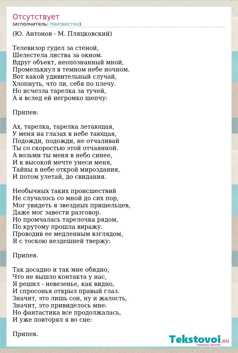(Ю. Антонов - М. Пляцковский) Телевизор гудел за стеной, Шелестела листва за окном. Вдруг объект, неопознанный мной, Промелькнул в темном небе ночном. Вот какой удивительный случай, Хлопнуть, что ли, себя по плечу. Но исчезла тарелка за тучей, А я вслед ей негромко шепчу: Припев: Ах, тарелка, тарелка летающая, У меня на глазах в небе тающая, Подожди, подожди, не отчаливай Ты со скоростью этой отчаянной. А возьми ты меня в небо синее, И к высокой мечте унеси меня, Тайны в небе открой мироздания, И потом улетай, до свидания. Необычных таких происшествий Не случалось со мной до сих пор, Мог увидеть я звездных пришельцев, Даже мог завести разговор. Но промчалась тарелочка рядом, По крутому прошла виражу. Проводив ее медленным взглядом, Я с тоскою нездешней твержу: Припев. Так досадно и так мне обидно, Что не вышло контакта у нас, Я решил - невезенье, как видно, И спросонья открыл правый глаз. Значит, это лишь сон, ну и жалость, Значит, это привиделось мне: Но фантастика все продолжалась, И уже повторял я во сне: Припев.