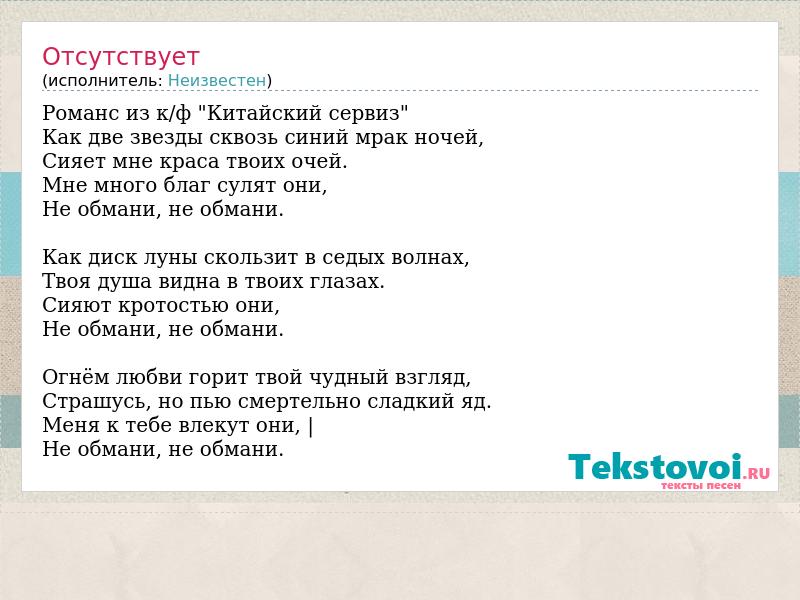 Романс из к/ф "Китайский сервиз" Как две звезды сквозь синий мрак ночей, Сияет мне краса твоих очей. Мне много благ сулят они, Не обмани, не обмани. Как диск луны скользит в седых волнах, Твоя душа видна в твоих глазах. Сияют кротостью они, Не обмани, не обмани. Огнём любви горит твой чудный взгляд, Страшусь, но пью смертельно сладкий яд. Меня к тебе влекут они, | Не обмани, не обмани.